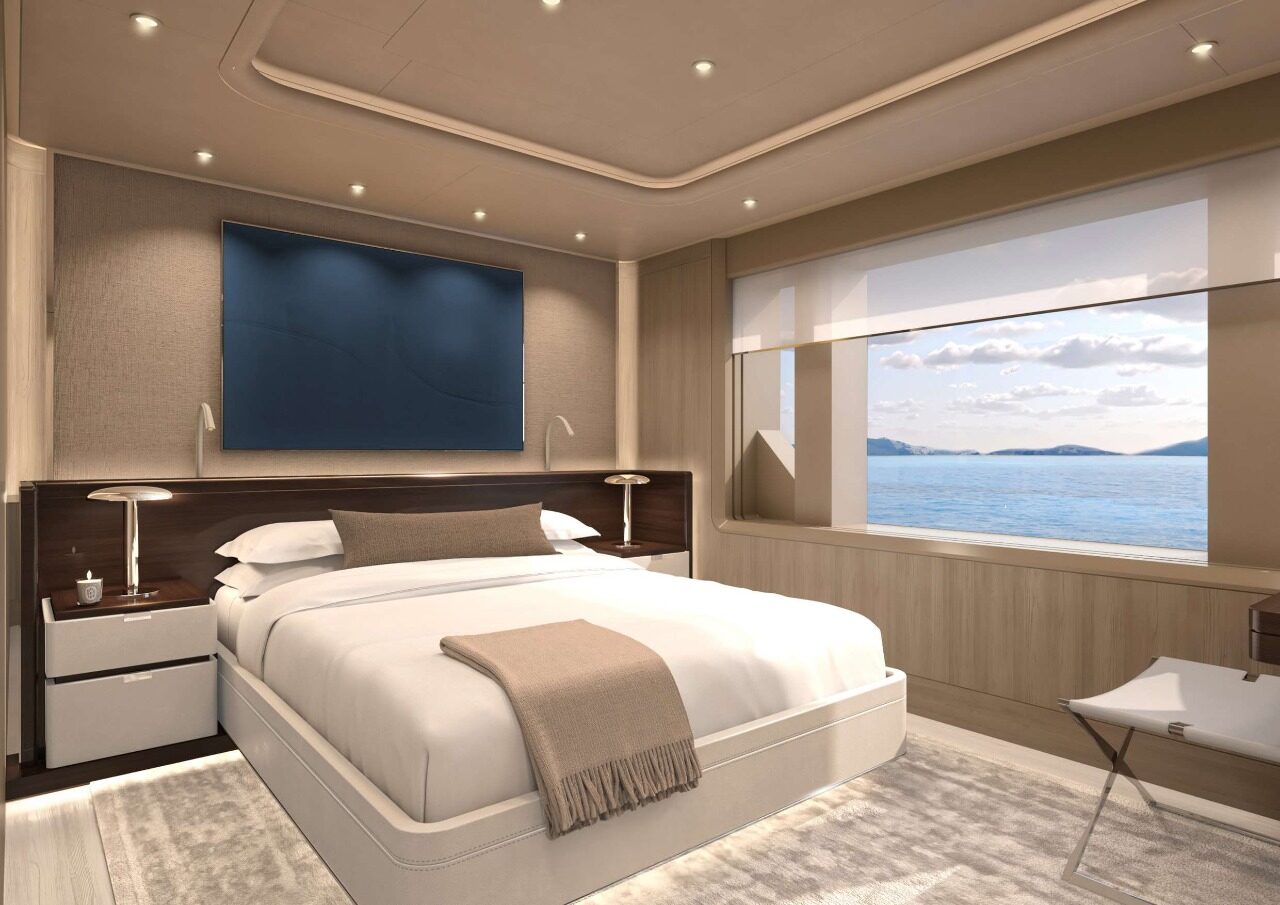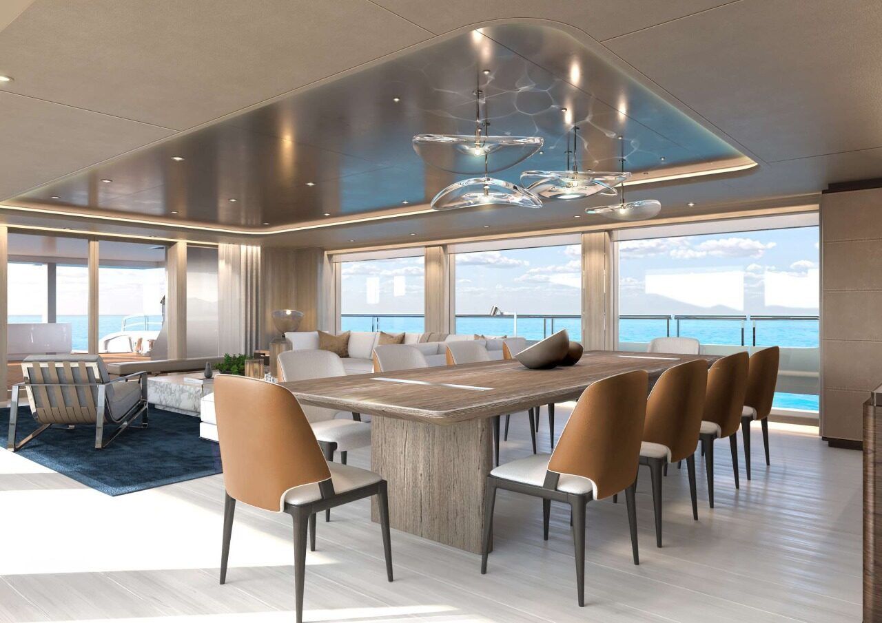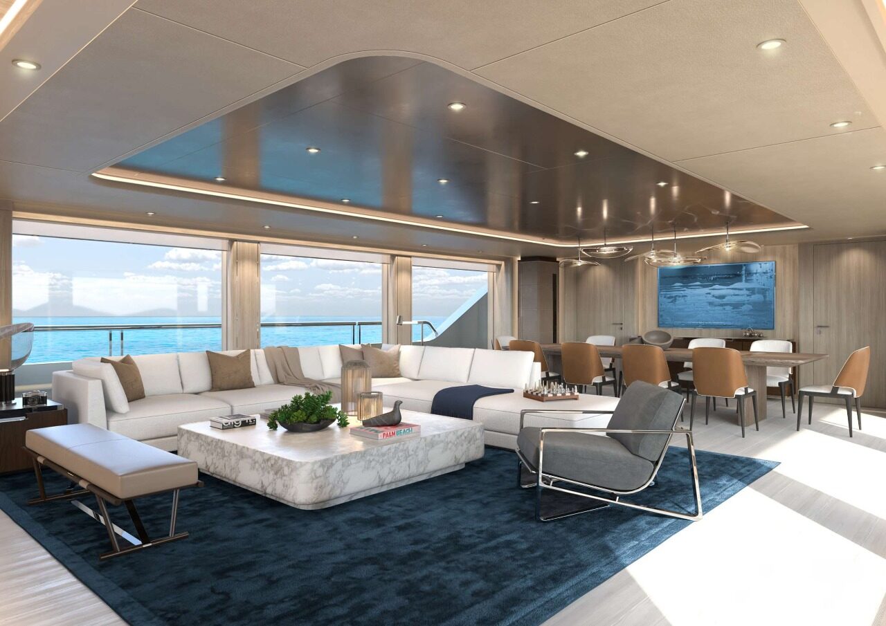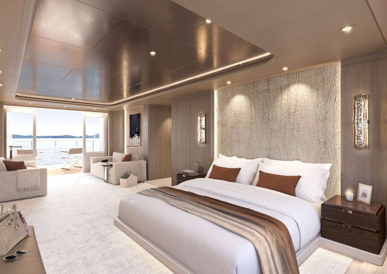 Inside, Harrison Eidsgaard’s approach is one of tactile modernism—layering warm neutral textures with oceanic accents and high-contrast details. Soft cream leathers, brushed bronze metals, whitewashed timbers, and deep blue velvets evoke a sense of calm, grounded luxury. The main salon on the main deck opens through floor-to-ceiling glass to expansive side decks, offering panoramic views and a flexible arrangement that balances formal dining with relaxed lounging. With accommodation for up to 12 guests in six finely appointed staterooms—including a full-beam Owner’s Suite with private folding balcony—A6008 invites guests into a floating world of elegance, exclusivity, and personalized refinement.