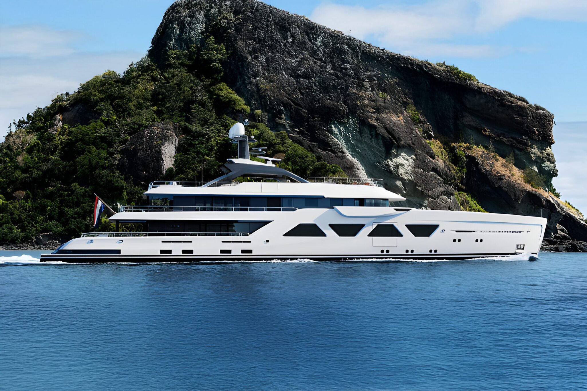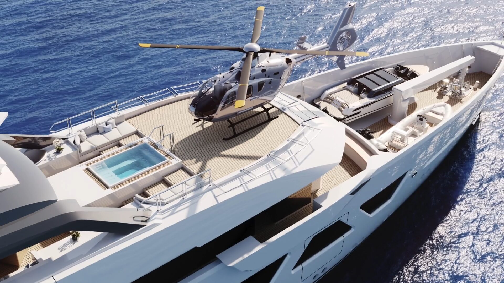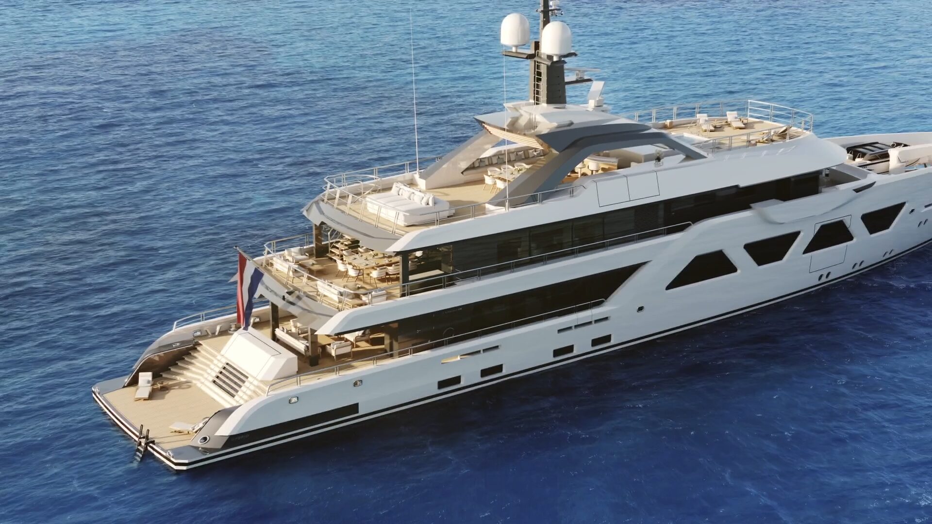 From her hydrodynamic steel hull to her aluminium superstructure, A6008 is engineered for efficiency, stability, and reduced noise and vibration—creating an exceptionally quiet environment for owners and guests. Her fastidious construction, performed under stringent Lloyd’s and Red Ensign Group LY3 standards, ensures safety, reliability, and world-cruising capability in even the most remote destinations. The seamless exterior flow culminates aft in a spacious beach club accessed via a fold-down transom door, creating an open-air platform just above sea level. This space effortlessly connects with the tender storage and dive setup forward, where a foredeck crane discreetly manages her custom tender and rescue boat launch operations.