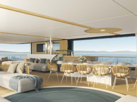 The main deck and salon are designed for socializing and entertainment, with spacious lounges, dining areas, and panoramic views. Outdoor decks offer multiple lounging and dining areas, including shaded aft decks and sun-soaked foredeck spaces, perfect for al fresco meals and relaxation.