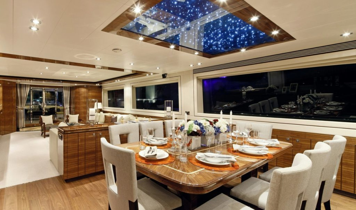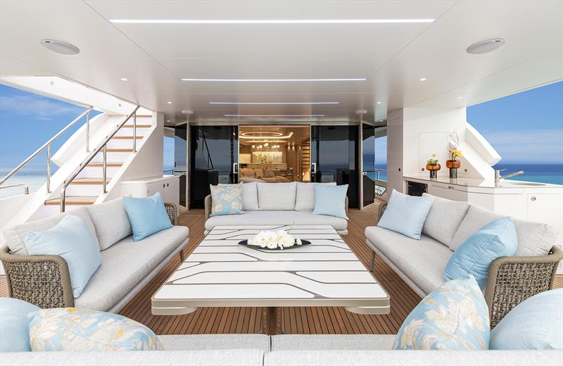 Expansive exterior decks provide multiple areas for relaxation and entertainment, including al fresco dining spaces, sun lounging areas, and a versatile skylounge. Inside, large panoramic windows allow natural light to flood the main salon and upper deck lounge, enhancing the sense of openness and connection to the sea.