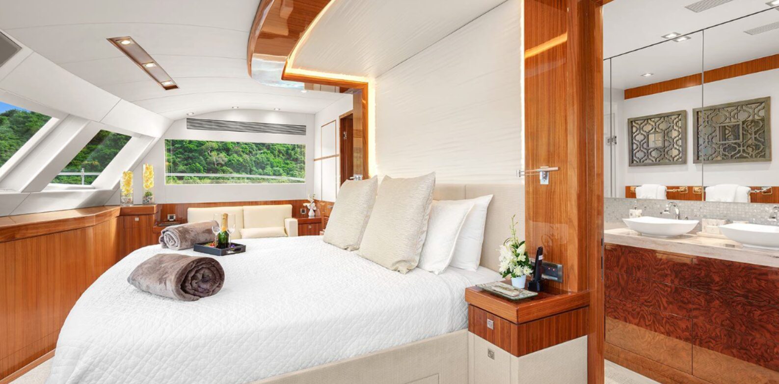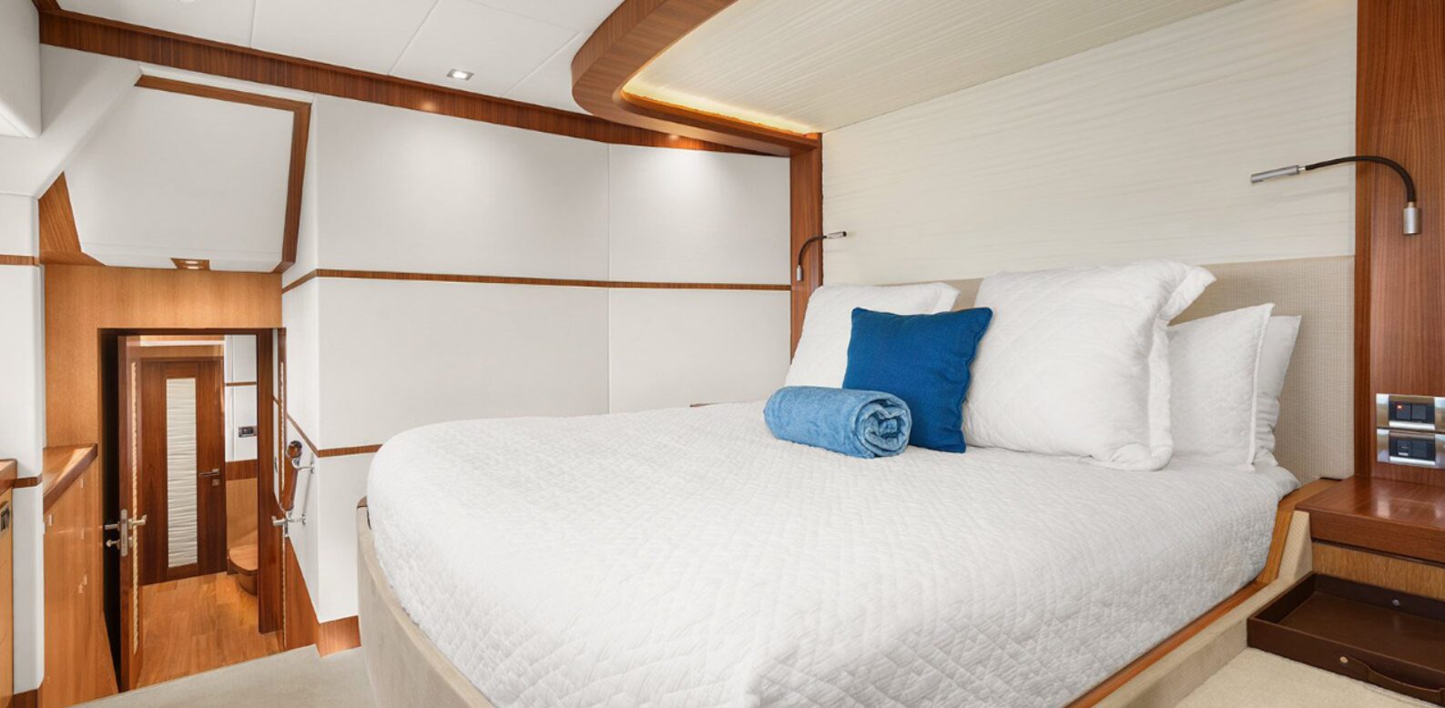 Accommodation aboard the PC74 is both generous and flexible, with space for up to 8 guests across four well-appointed cabins. Each cabin features natural light, ample storage, ensuite facilities, and refined finishing touches that create a welcoming yet sophisticated environment. Forward crew quarters allow comfortable accommodation for up to two crew members in their own dedicated cabin, ensuring professional service while maintaining guest privacy.
