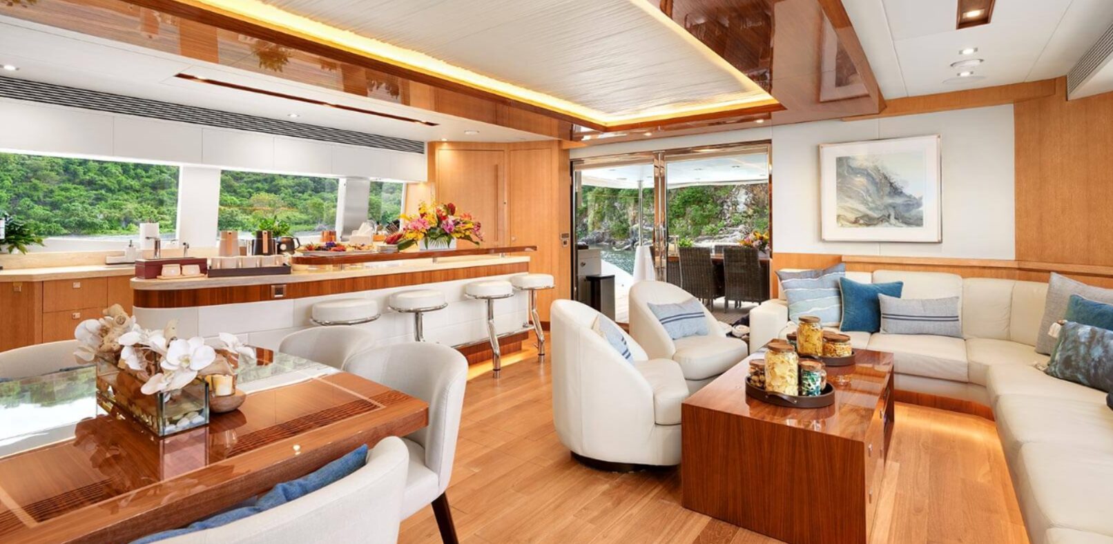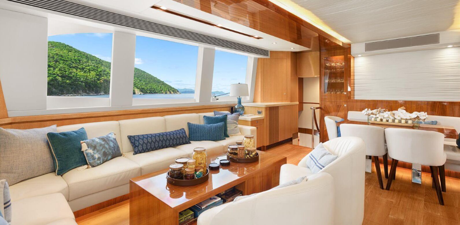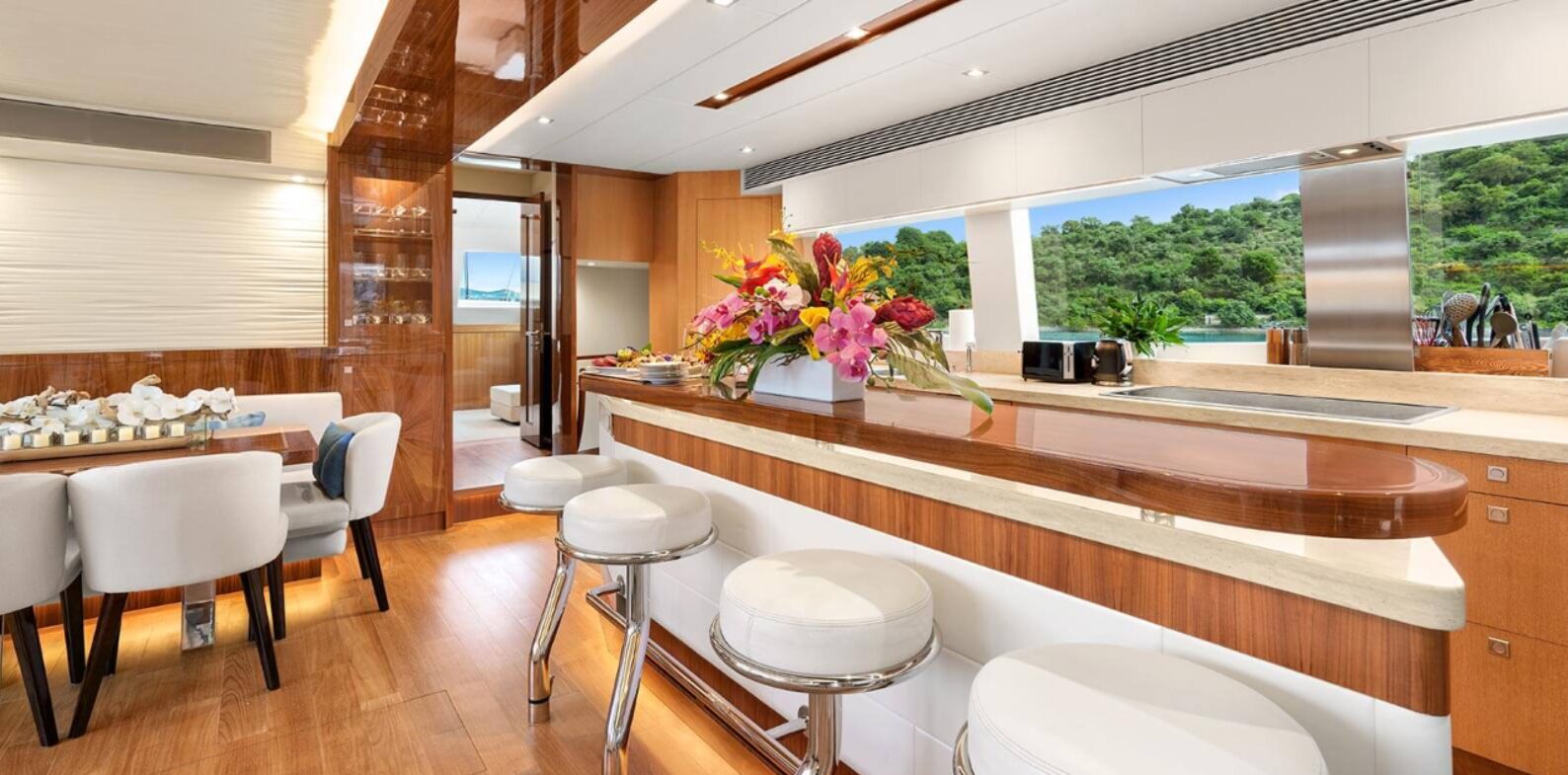 The interior salon and galley flow into one integrated living space, ideal for entertaining and relaxed social interaction. Large panoramic windows and sliding doors enhance the indoor-outdoor connection, leading to expansive deck areas perfect for al fresco dining, sun lounging, or quiet relaxation under way or at anchor.