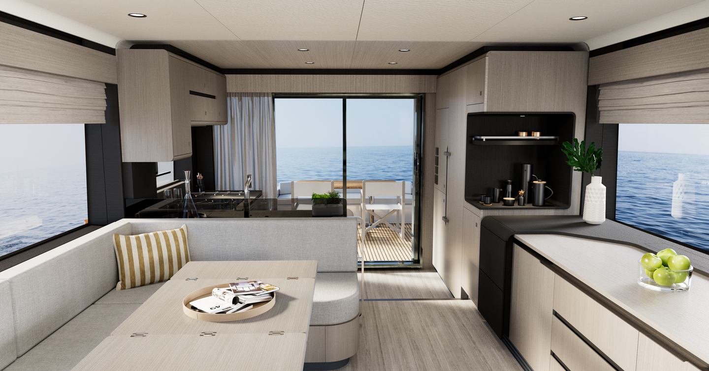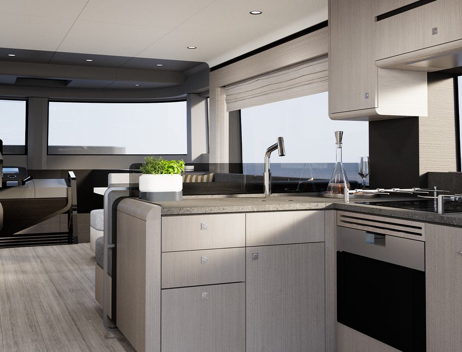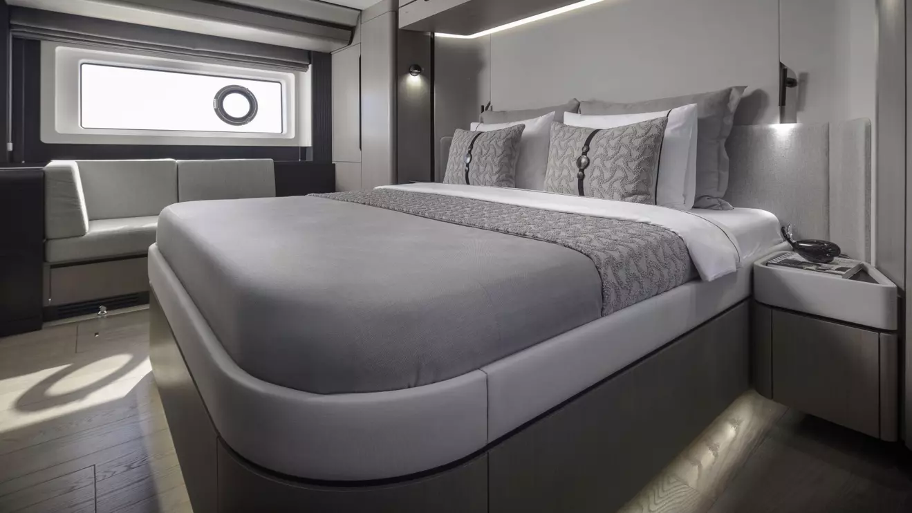 The interior layout is thoughtfully designed to maximise space and livability, featuring three well-appointed guest cabins accommodating up to six guests, along with the option for a dedicated crew cabin for added flexibility. Large windows throughout the yacht provide abundant natural light and panoramic views, enhancing the sense of openness and connection to the surrounding seascape. High-quality materials, refined finishes, and intelligent storage solutions reflect Sirena Yachts’ commitment to craftsmanship and attention to detail.