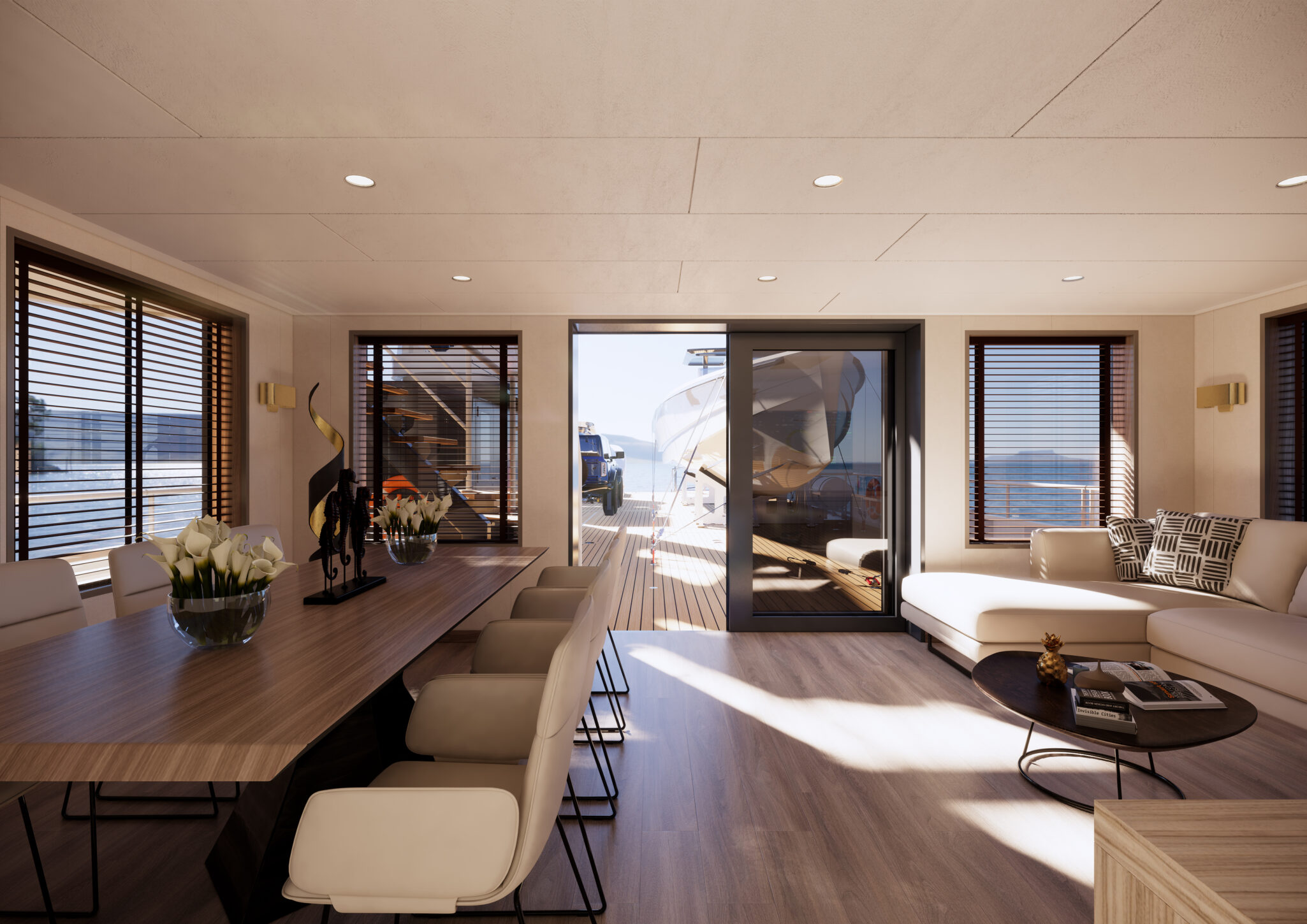 Inside, her design is highly adaptable—purpose-driven with crew efficiency, technical performance, and mission readiness at its core. She accommodates up to 16 staff, pilots, expedition leaders, or specialists, and features extensive storage and launch capacity for toys, tenders, submersibles, helicopters, and humanitarian aid. Every space aboard Yacht Support 53 (04) is engineered for optimal workflow, from her heavy-duty deck cranes and climate-controlled hangars to her state-of-the-art dive center and workshop facilities.
