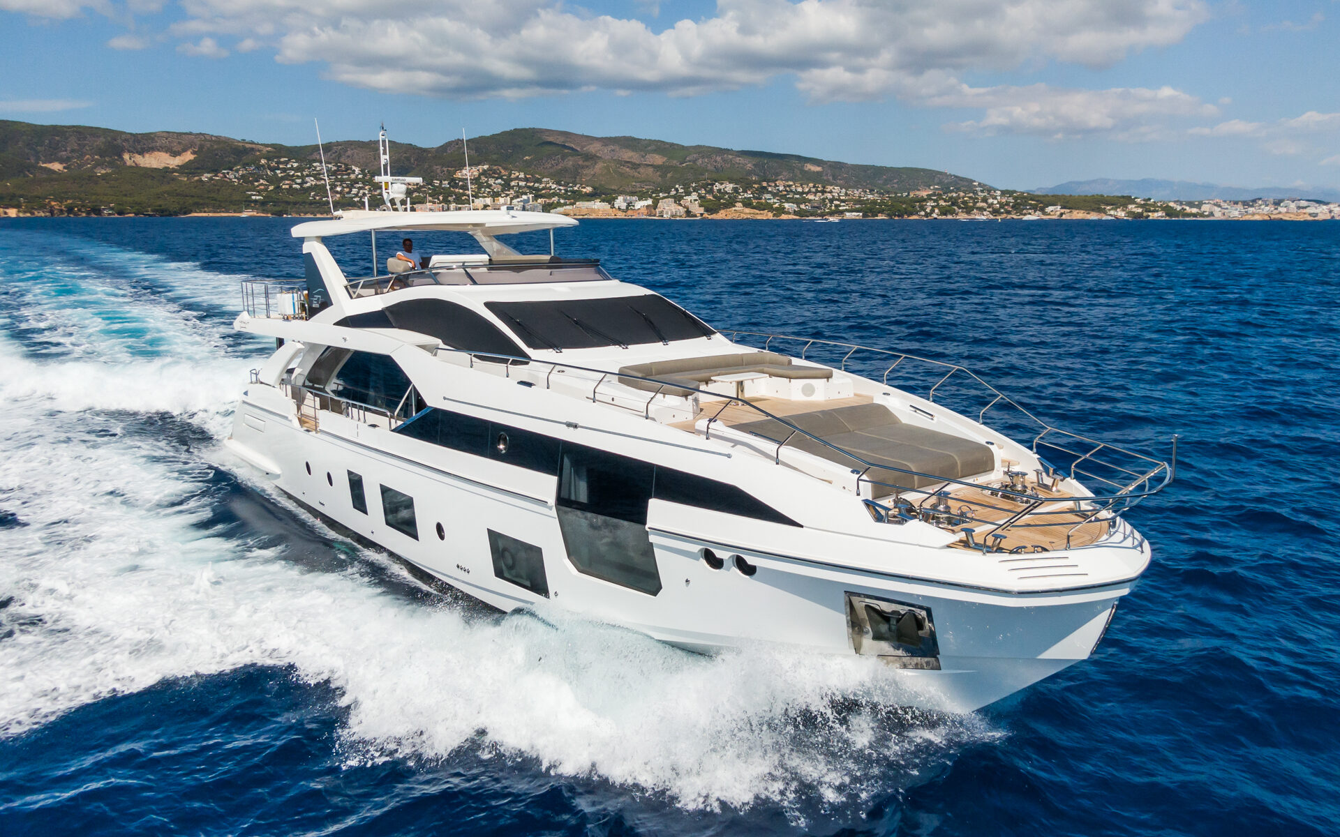 She boasts a fabulous two-deck exterior living space, perfect for the East Mediterranean’s warmer climate. The aft deck is generous and offers built-in seating, an alfresco dining table and optional complete roll down enclosures, ideal for any weather or occasion. The social upper deck features further dining and entertainment alternatives with a service station, jacuzzi and chaise longues where guests are able to unwind and relax.
