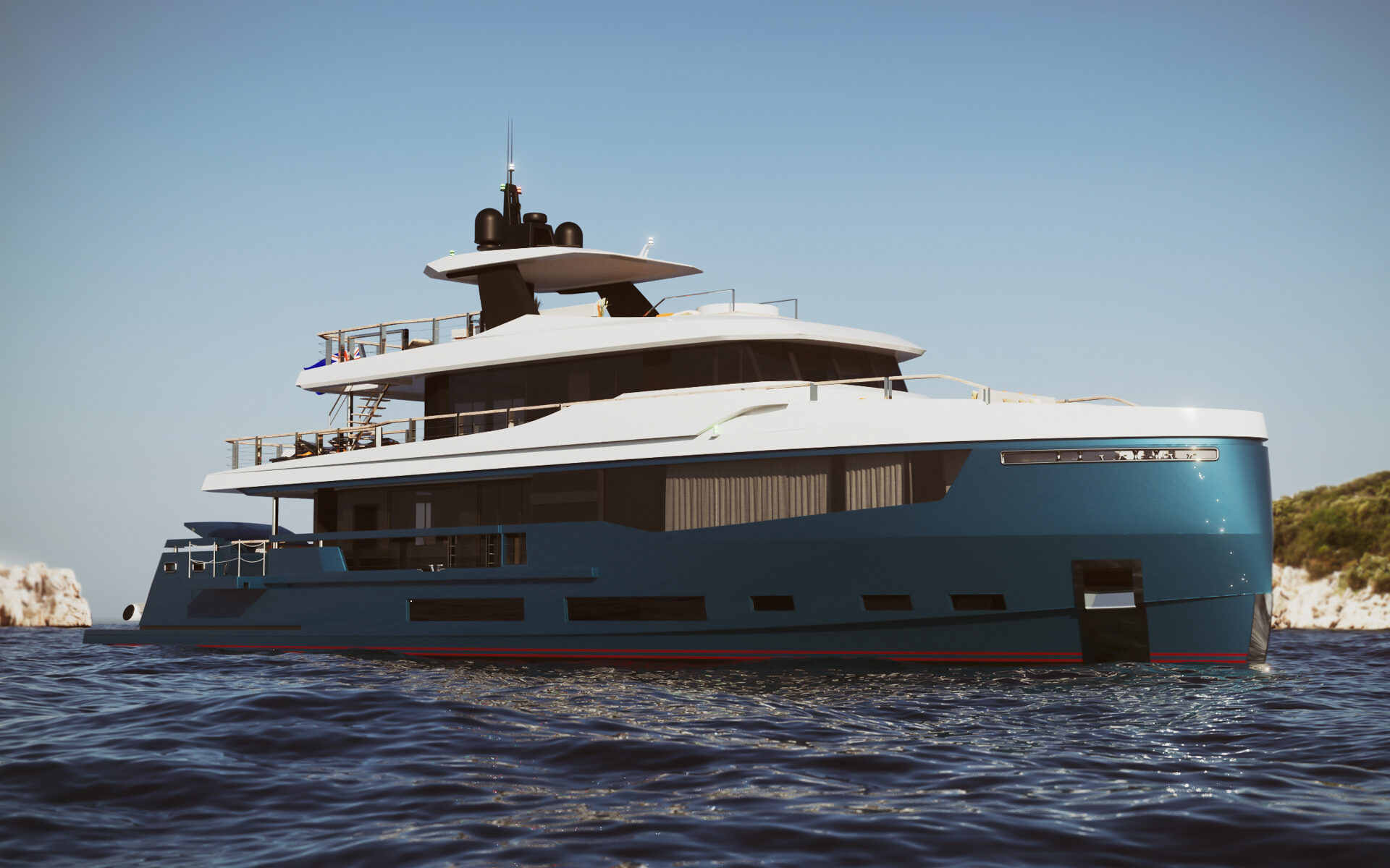 The yacht is characterised by a wide body and a superstructure that provides excellent space inside for guests. Very large windows on either side of the lower deck allow for magnificent views and light. Morning Star features such state-of-the-art features as opening terraces at the bow for the owner’s suite and mid-ships for the main salon.