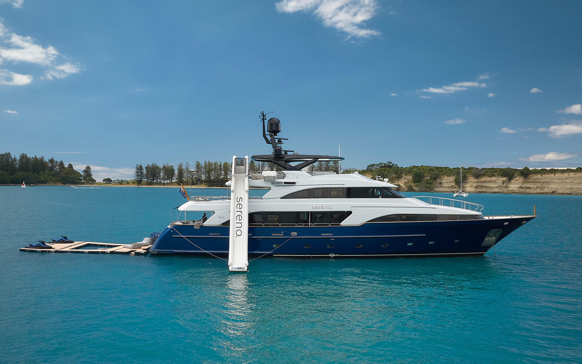 SERENO is equipped for adventure with an impressive selection of water toys. Two Sea-Doo jet skis, two Seabobs, and an eFoil board provide high-energy fun, while wakeboards, water skis, and towables add to the thrill. A floating golf setup and inflatable slide from the sundeck offer unique entertainment, and the inflatable swim platform ensures easy access to the water. The 11.8m Intrepid chase tender provides seamless shore excursions and towable toy enjoyment.
