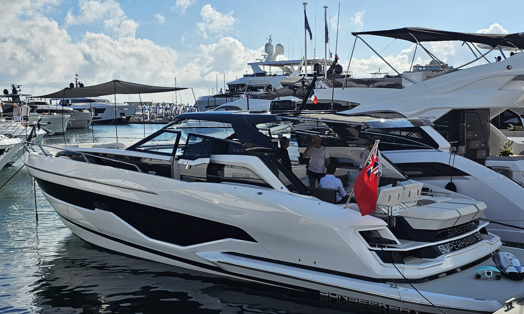 Boarding the GTX116 is an experience in itself. The central walkway, flanked by sleek railings, leads you to a transformative platform that rises and extends into the water. But it’s the view that truly captivates: a mezzanine cockpit, crowned by imposing satellite domes, and a sweeping staircase ascending to the skydeck. This is a yacht designed to impress.