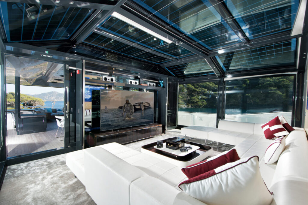 The upper deck offers a fabulous lounging and a bar area, as well as a comfortable dining table for 12 guests. Upper deck midships there is a family room offering panoramic views and cinema facilities