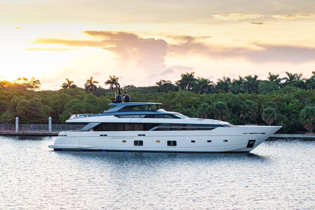 Launched in 2023, SOFI VI is a pristine Sanlorenzo SL120 Asymmetric designed by Zuccon with interiors by Marty Lowe. Her innovative asymmetric layout enhances volume and natural light, creating seamless