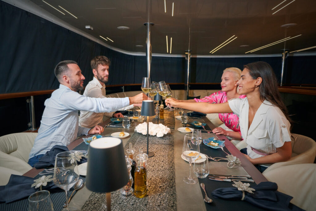Chef Marino Dikic and sous chef Ivica Mazar helm Aeterna’s galley, crafting dishes that rival Michelin-star restaurants. Lunch features family-style spreads of lamb ragù, roasted feta soup, and grilled amberjack, while dinners elevate the experience with Cadoret oysters, wagyu tartare, and Dalmatian delicacies.