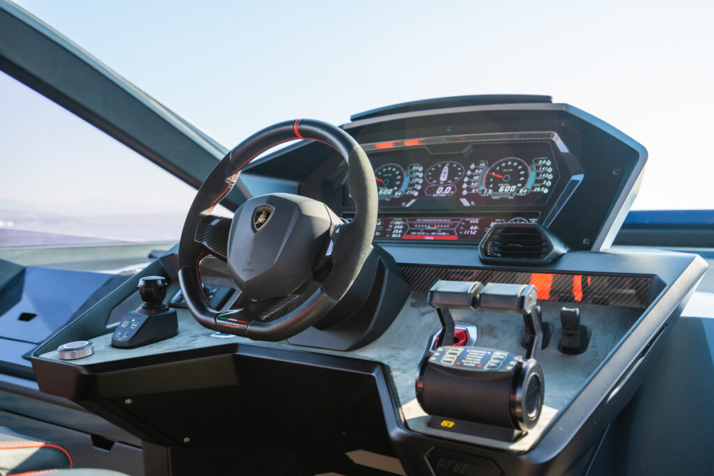 The seating is both comfortable and stylish, with Lamborghini bull logos etched into the backrests and racing-style straps for added security at high speeds. The helm station itself is a symphony of Lamborghini design, with digital displays, sporty controls, and a steering wheel that feels perfectly at home in a supercar.