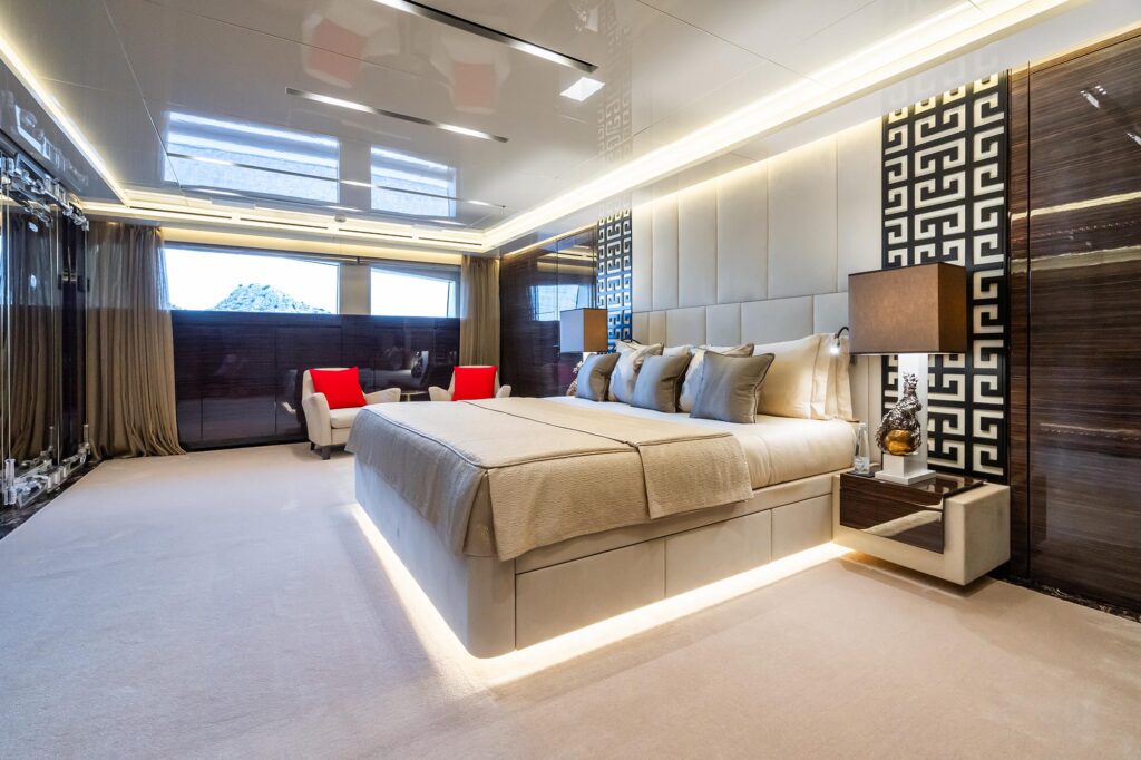 Accommodation includes five luxurious staterooms for up to 10 guests. The master suite, located on the main deck, is particularly spacious with a private balcony, gym, his-and-hers walk-in wardrobes, and a dressing room. The en suite is adorned by high-end finishes including a white onyx and black marble bathtub, his and her sinks and a large shower. Two additional VIP staterooms and two convertible twin rooms, which are all en suite, ensure comfort and privacy for all guests.