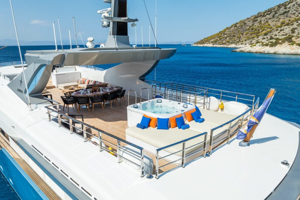 The yacht’s expansive flybridge includes a large Jacuzzi, sunbathing area, and a large teak dining table for 10 guests, ideal for outdoor entertainment. The main saloon, with sliding doors leading to a shaded aft lounge, offers a relaxing retreat. Inside, the yacht’s chic design features a elegant dining room with a statement bronze wall design.