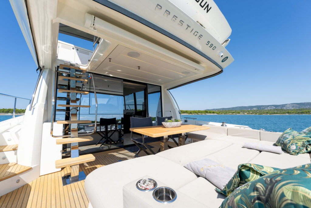 Designed for entertaining and relaxation, her exterior spaces include expansive bow sunpads, a flybridge with grill and fridge for those long summer days and generous al fresco dining aft. Inside, Prestige’s signature contemporary design creates a light-filled, welcoming atmosphere. She accommodates 6 guests in absolute comfort across 3 cabins, including a full-beam Master, a VIP and a versatile Twin/Double, plus separate crew quarters aft.