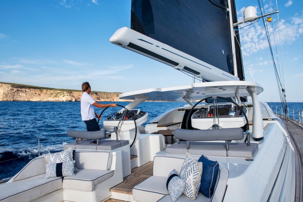 Her spacious layout includes comfortable accommodation for up to 10 guests in 4 elegant staterooms. Heading outdoors, there are many places to unwind, including a sunken relaxation space in the bow, suitable for sunbathing or reading a book in the optional shade, a sheltered al fresco dining area forward of the twin cockpit and additional relaxation space behind the cockpit, providing panoramic views and a seamless connection to the ocean. For the sun-filled days, DAKOTA’s hydraulic drop-down swim platform provides easy access to the water and an array of water sports toys. DAKOTA’s attentive crew of 6 will ensure guests have a safe and enjoyable charter, creating many wonderful memories.