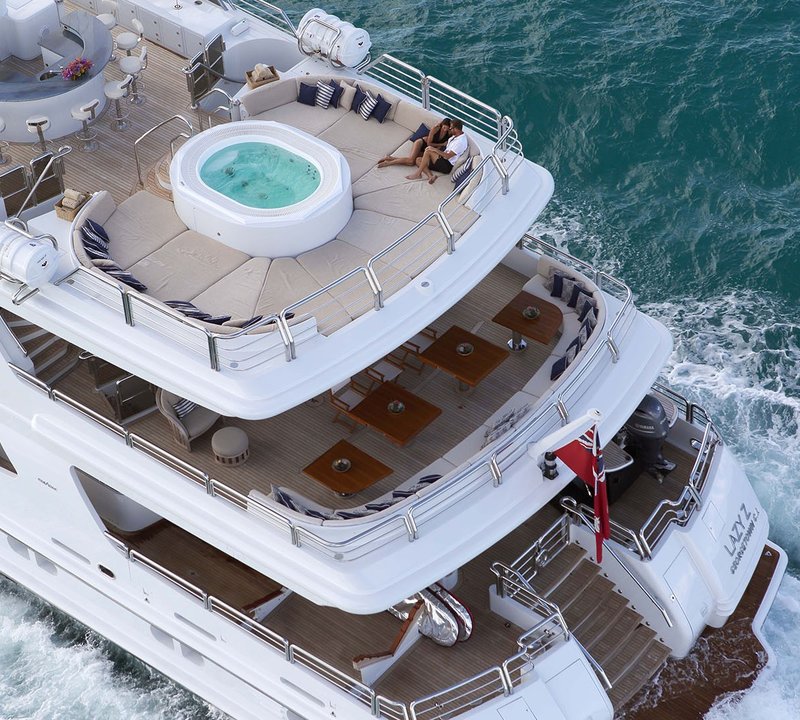 Inside, the main saloon offers a haven for elegant entertaining, while the Skylounge presents expansive views and total tranquillity. LAZY Z offers an exceptional yachting experience, whether for hosting large gatherings or enjoying intimate moments on board.