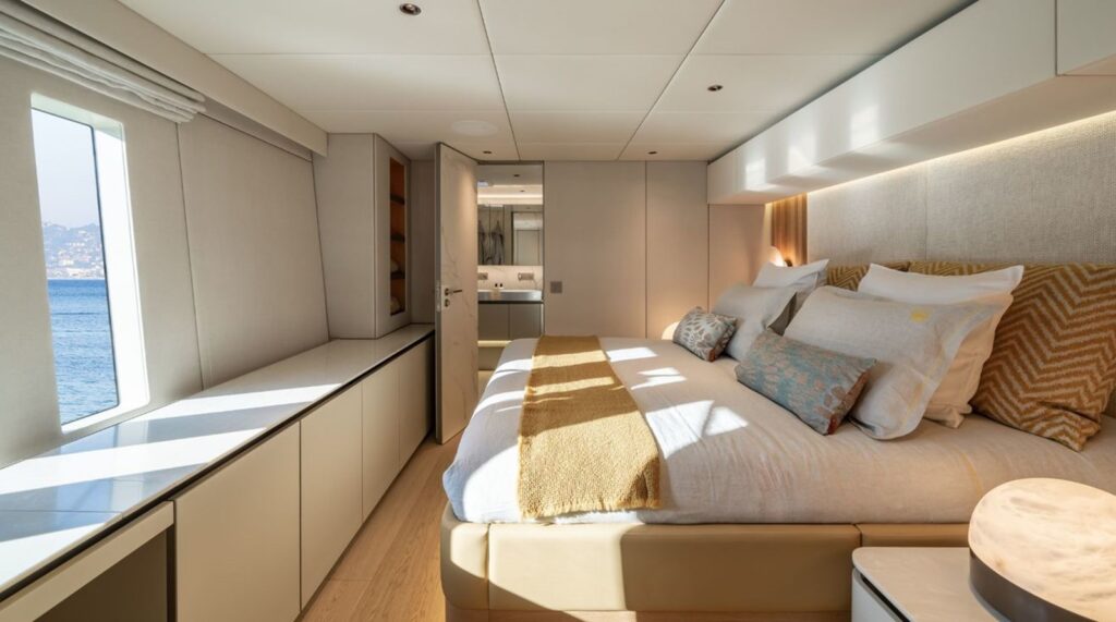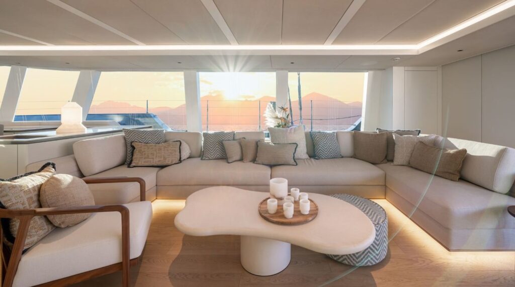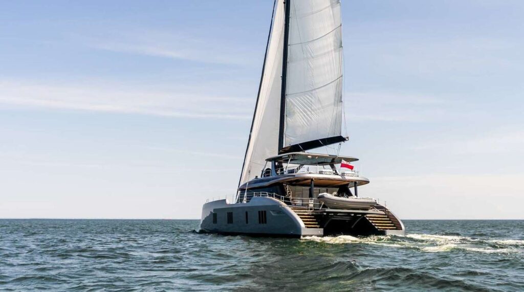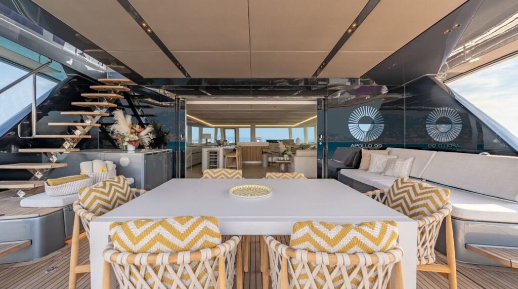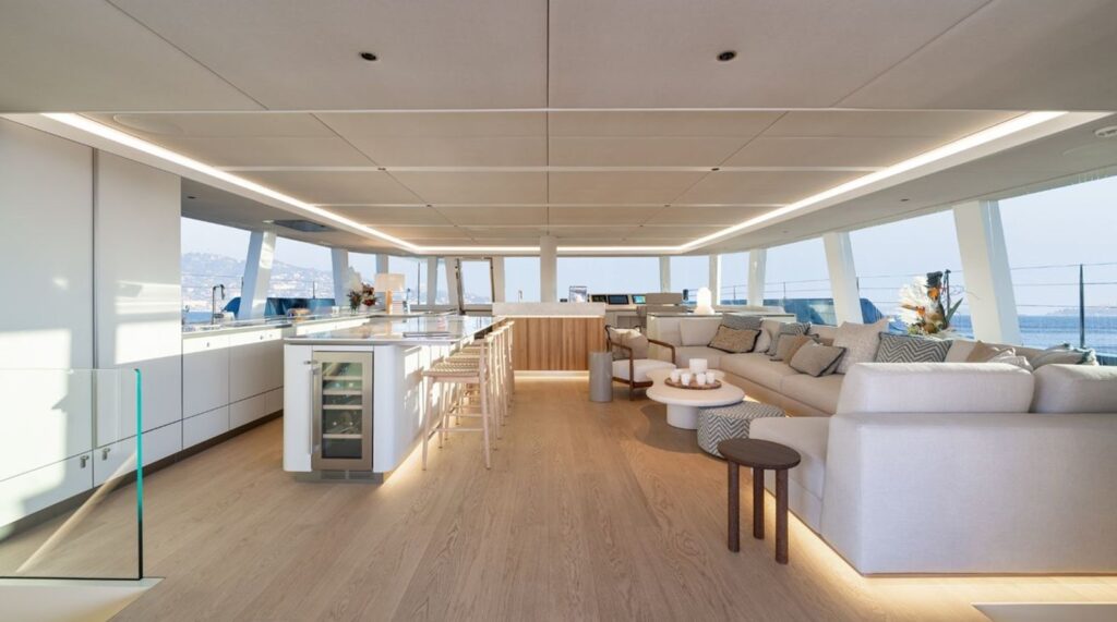 Delivered in 2023, APOLLO 99 is a Sunreef 80 Eco catamaran blending cutting‑edge green technology with ultra‑luxurious design. Powered by an advanced solar system generating 45.5kWp from 164m² of integrated panels, she offers silent, emission‑free cruising. With an 11.53m beam, she boasts vast living spaces and panoramic views. The serene, contemporary interior features neutral tones, organic materials, and floor‑to‑ceiling windows. Accommodation is for 8 guests in 4 cabins, including a master suite with walk‑in dressing, sofa, desk, retractable TV, and large ensuite. Outdoor areas include a convertible sunpad‑sofa, bar, alfresco dining, and a hydraulic aft platform that serves as a private beach. Onboard amenities also feature gym equipment and water toys. APOLLO 99 combines innovation, elegance, and eco‑responsibility, a rare chance to acquire a fully electric, state‑of‑the‑art luxury catamaran without the wait.