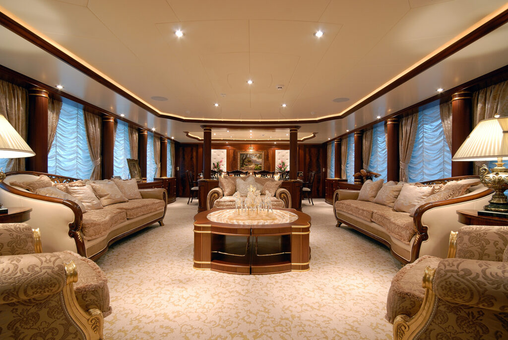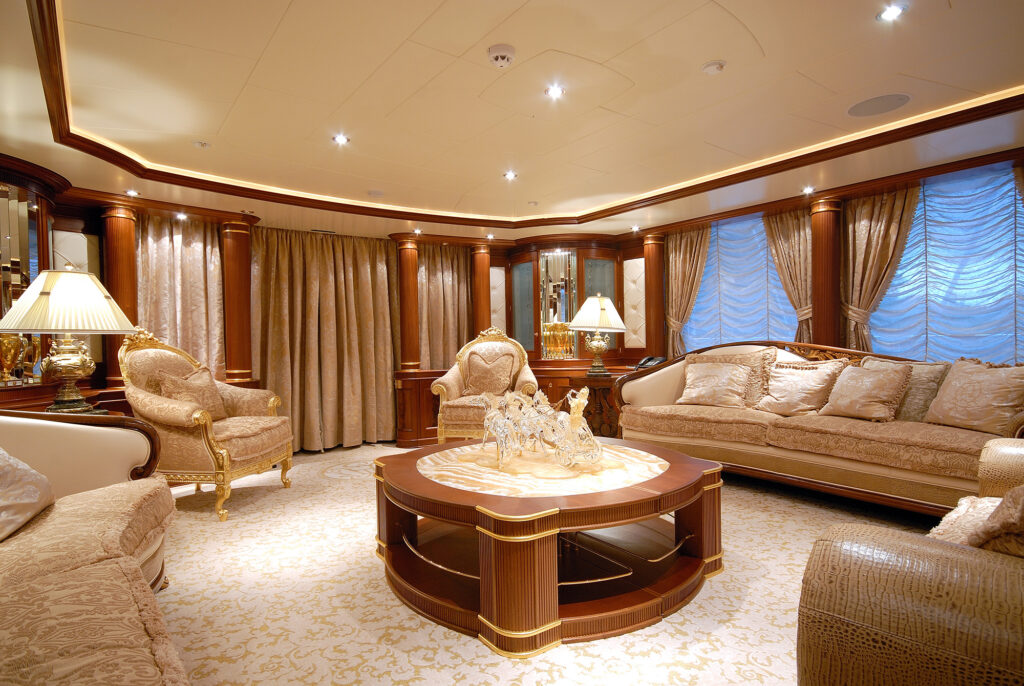 Her elegant interiors were designed by renowned designer Cristiano Gatto. The handcrafted interiors are a testament to the meticulous attention to detail, featuring precious materials such as onyx, Sicis micro-mosaic, and custom silk carpets.