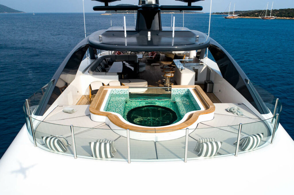 STARBURST III boasts impressive leisure and entertainment facilities, with two jacuzzis, one with a magnificent glass bottom on the sun deck and the other on the foredeck adjoined to a large seating and sunbathing area. Other special features include a beach club gymnasium, a stunning master suite with a fold-down sea balcony and a show-piece spiral staircase illuminated by a central light.Â