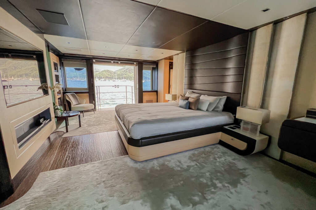 UNASOLA features an interior and exterior design by Alberto Mancini Yacht Design and naval architecture by Overmarine. Up to 12 guests can be accommodated in 5 cabins as well as 7 crew members including the captain.
