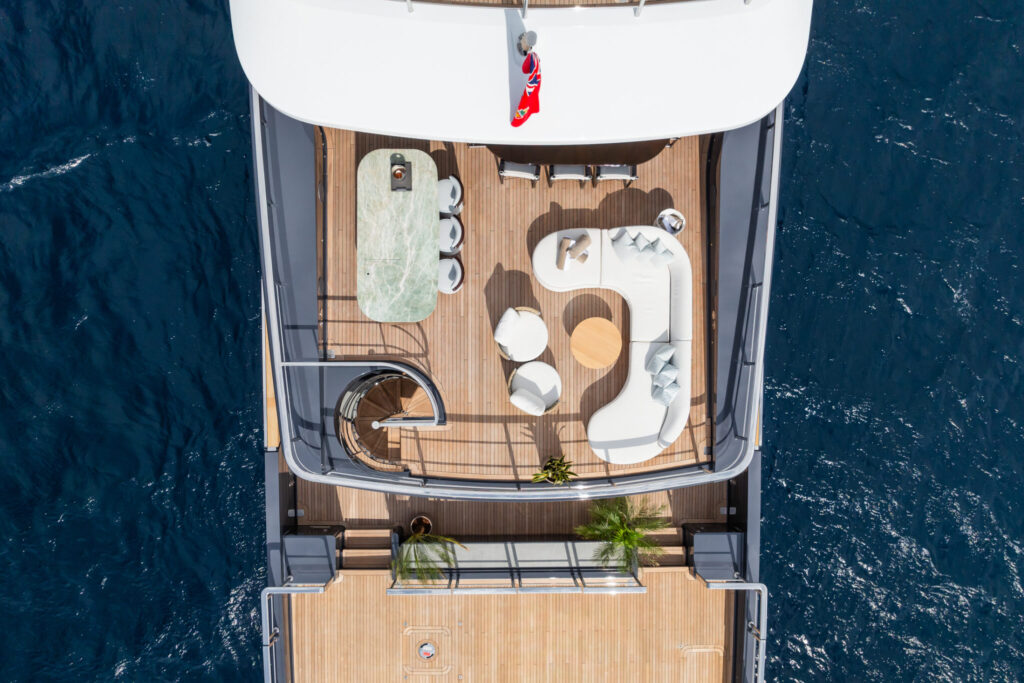 M boasts expansive exterior areas ideal for relaxation and entertainment. The generous sundeck includes an observation lounge, Jacuzzi, full bar, and ample sun loungers. The upper deck continues the theme of effortless luxury, with a wet bar, an extendable dining table for casual al fresco meals, and seamless access to the upper saloon through sliding glass doors. A refined, neutral interior palette and bespoke furnishings enhance the onboard experience, reflecting the yacht’s contemporary yet timeless character.