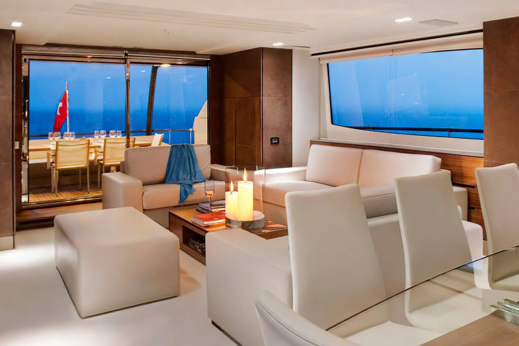 Inside, she has opulent interiors which show a meticulous attention to detail and finish. The main saloon and dining area are open plan with large windows giving panoramic views and offering the chance to relax, dine and entertain in style.Â