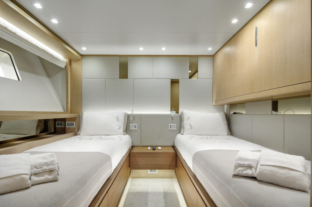 12 guests are comfortably accommodated in 5 luxurious en-suite staterooms. Boasting flexible accommodation across a full-beam master on the main deck (with an office), 2 VIP double staterooms and 2 x twin staterooms, each with an additional pullman berth.