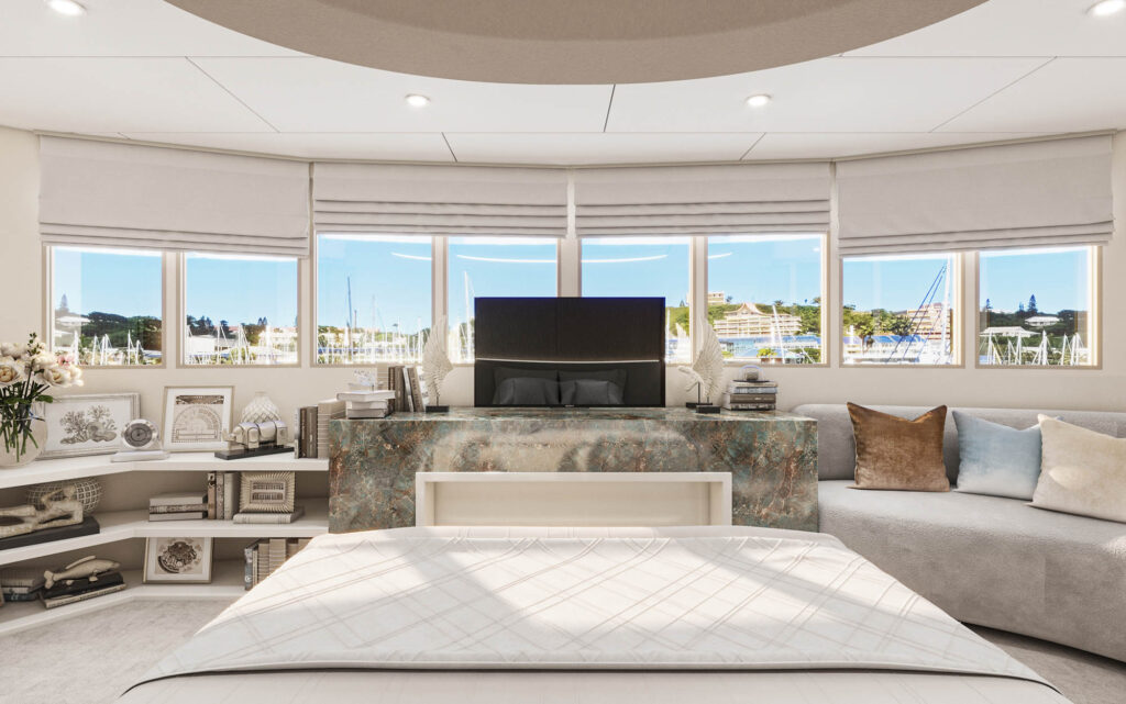 The thoughtful furnishing and attention to detail creates an intimate environment, despite the yacht’s vast spacious interior areas. It’s design focuses on delivering the ultimate pleasure for her guests with 4 x master staterooms – all with his and hers en suite bathrooms, with a further 4 double staterooms with king size beds and 2 twin staterooms. All staterooms come with en suites and smart TVs including satellite TV.