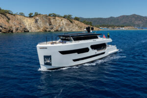 At 55 feet (16.48m) this sizzling VanDutch offers a max speed of 36 knots, flexibility for cruising with a range of 400nm (at 24 knots) and great volume including accommodation for 4 guests in 1 double & 1 twin cabin and spacious exterior with lounging areas, a sheltered, retractable dining zone and an electric bimini.