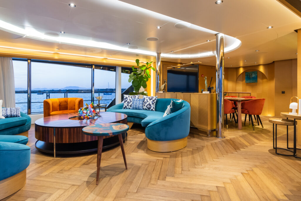 The salon features a modern design palette with a blend of soft neutral tones, high-gloss wood finishes, and sleek metallic accents. Rich fabrics and carefully chosen furnishings create a harmonious balance of comfort and style. The main salon is equipped with a cutting-edge entertainment system, including a large flat-screen TV, surround sound, and smart technology for streaming music or movies, ensuring guests have plenty of options for relaxation.