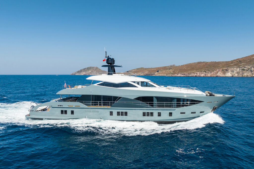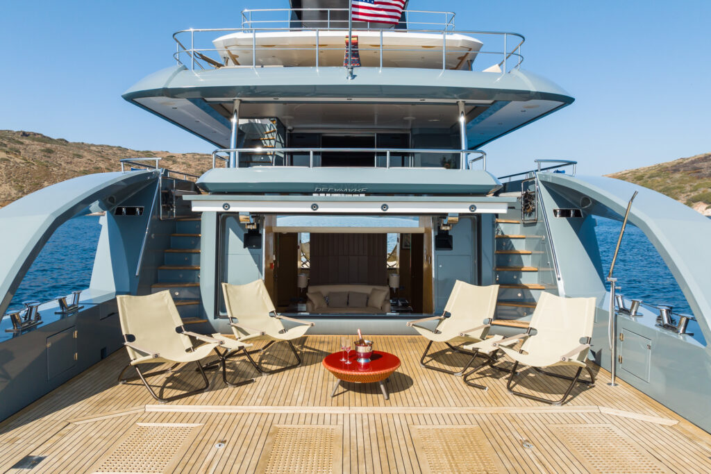 The yacht features a newly installed hydraulic swim platform, enhancing accessibility to the water for swimming and launching water toys, and facilitating seamless transitions between the yacht and tenders.