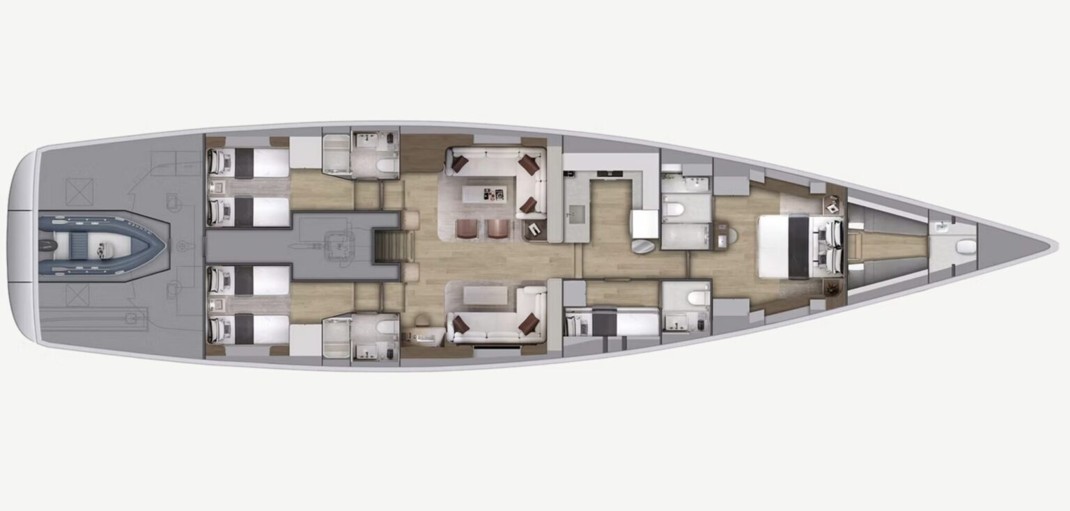 The spacious aft deck transforms into a luxurious retreat, perfect for Mediterranean summers. Below deck, the refined Mishi Concept interior elevates onboard living, proving that high-performance sailing and ultimate comfort can coexist.