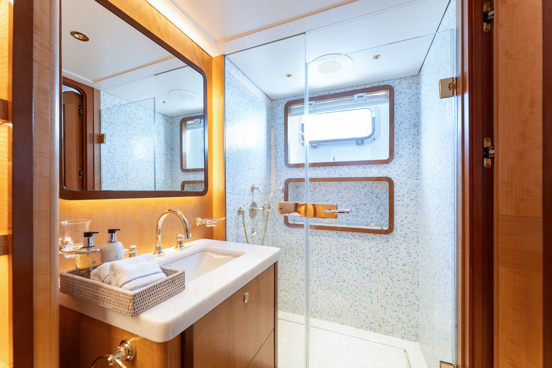 The full-beam master suite, located on the main deck, offers unparalleled luxury and privacy. Accessible through a private walkthrough—which can be converted into an additional cabin if required—this suite features a king-sized bed, a dressing and vanity area, and an en-suite bathroom adorned with a playful mosaic design. Large windows provide natural light and stunning sea views, creating a serene retreat for the primary guests.