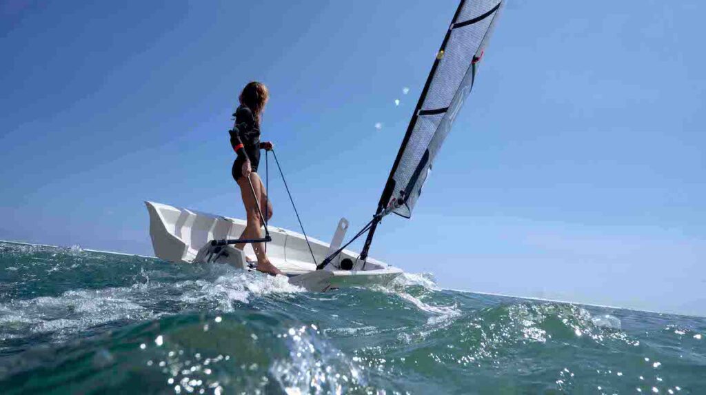 Assemble the hull, thread the mast into the sail cover just like a windsurfer, clip on the boom, add the rudder and daggerboard and you’re ready to go.