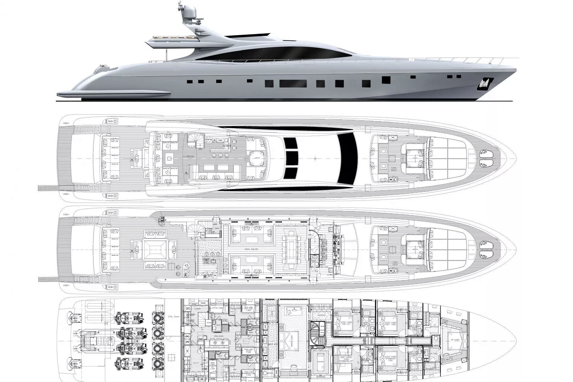 The AAA yacht features a well-designed layout that maximizes comfort and enjoyment. The main deck encompasses a spacious salon and dining area, providing a central hub for socializing and fine dining. The upper deck offers a versatile sky lounge for relaxation and entertainment. Outdoor decks include a foredeck with a jacuzzi and sun loungers, an inviting aft deck with seating areas and a bar, and a sundeck for sunbathing and panoramic views. Dedicated crew areas ensure seamless service. This thoughtfully planned layout ensures a harmonious balance between socialization, relaxation, and privacy throughout the yacht.