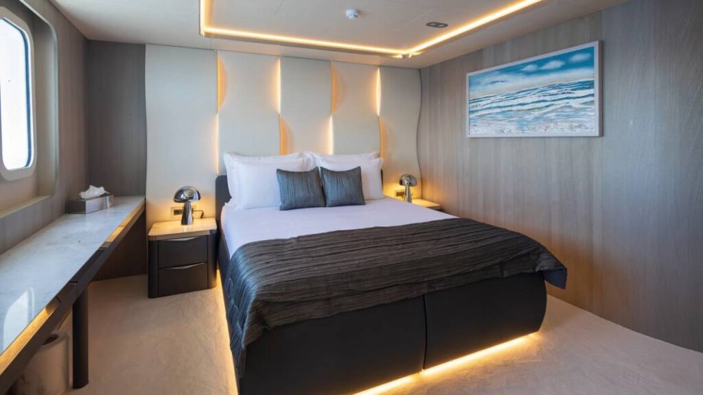 The spacious cabins are havens of tranquility, featuring plush bedding and panoramic windows that frame the mesmerizing seascapes.