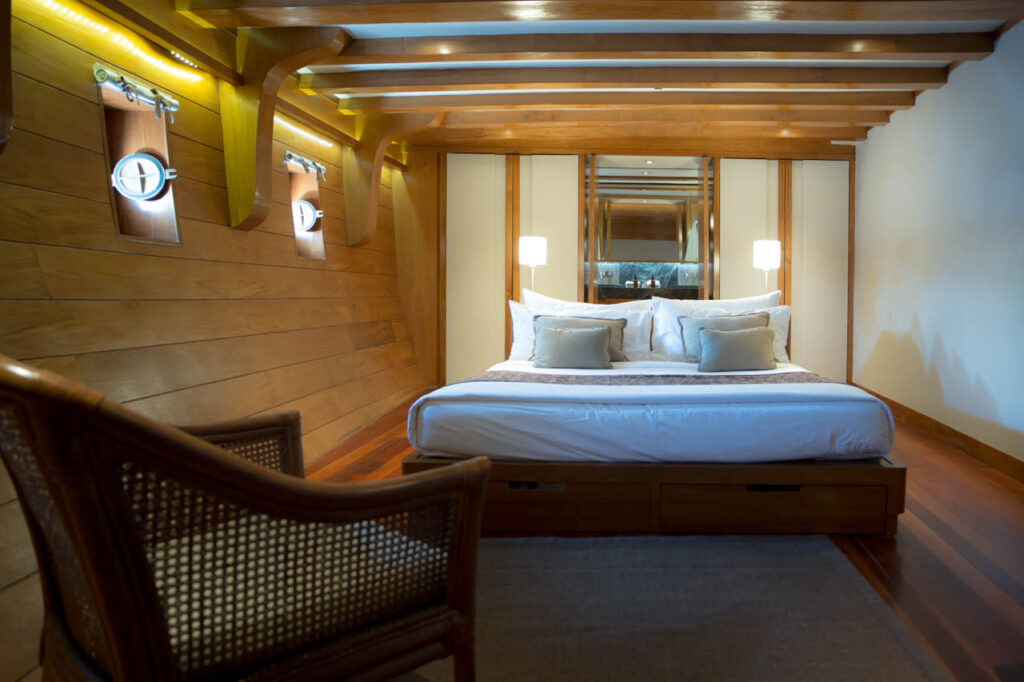 The spacious cabins are havens of tranquility, featuring plush bedding and panoramic windows that frame the mesmerizing seascapes.Â