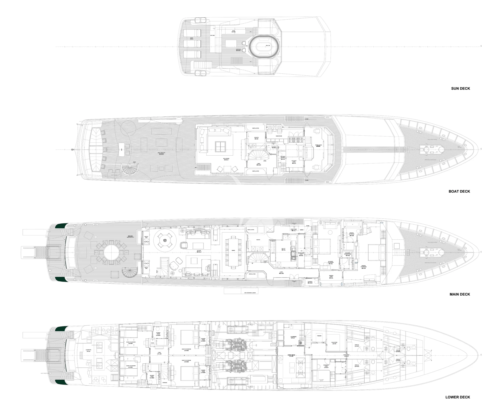 EMERALD’s layout is a testament to both luxury and functionality, meticulously designed to provide the ultimate in comfort and convenience for guests. Upon boarding, guests are greeted by an expansive main deck featuring a generous salon. This space serves as the social hub of the yacht, where guests can gather for relaxation and entertainment while enjoying panoramic views of the surrounding seascape. Ascending to the bridge deck, a spacious sky lounge awaits, offering sweeping vistas and additional opportunities for leisure and socializing. For accommodations, EMERALD offers an array of luxurious cabins distributed across multiple decks. The full-beam Master Cabin, exuding opulence and comfort, features a double bed, office space, and a relaxation area, complemented by an ensuite bathroom with a lavish bath. Nearby, the Main Deck VIP Cabin offers comparable luxury, boasting a double bed, desk, couch, and ensuite with bath. Additional cabins on the lower deck include two double cabins and two convertible twin cabins, each equipped with desks, windows offering views of the outdoors, and ensuite bathrooms for added comfort and privacy.