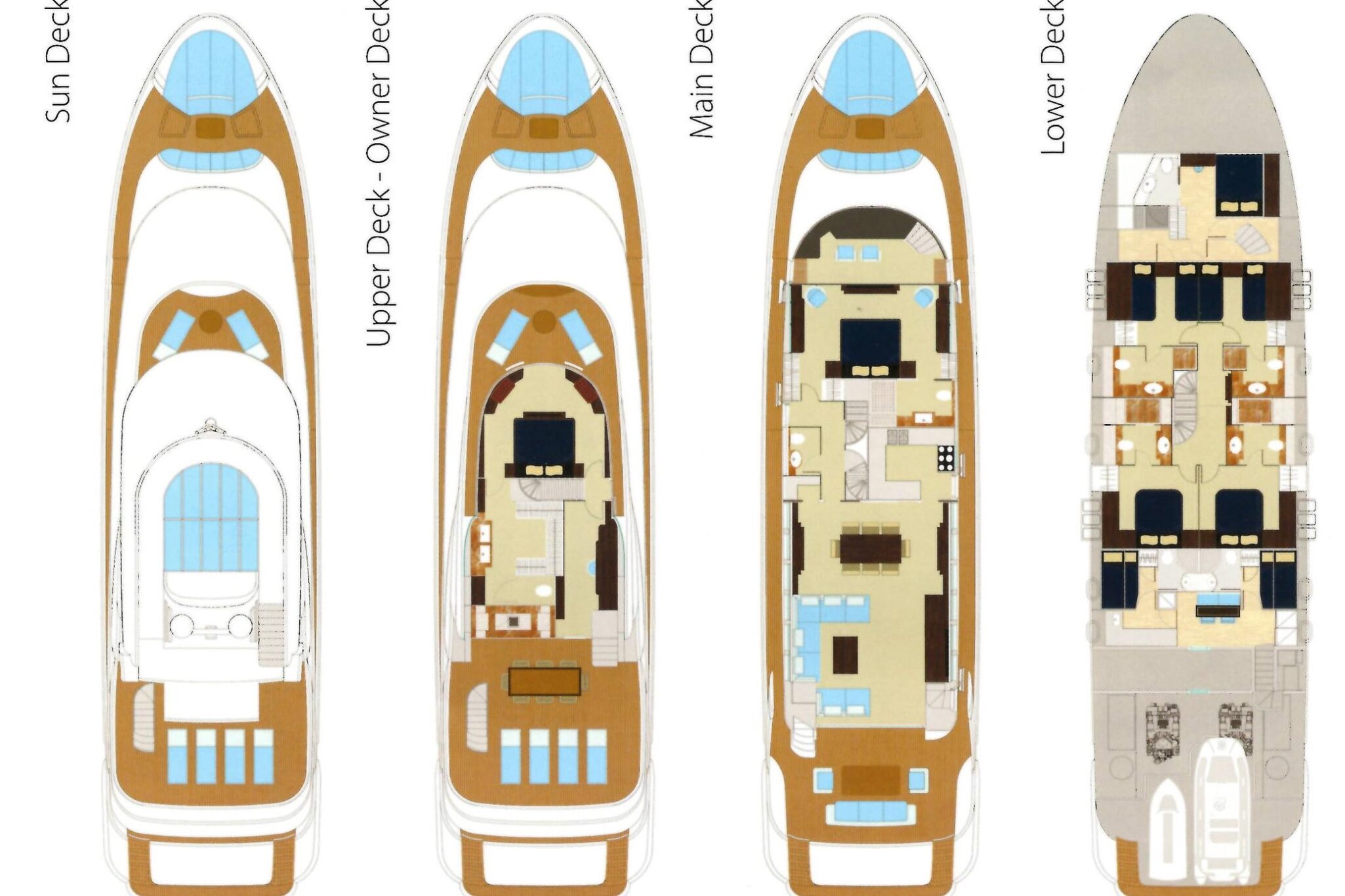 Gatsby is designed to be eco-friendly and majestic. On the main deck, the outdoor seating area beckons you for leisurely moments while the main saloon and adjacent dining area exude charm and sophistication. The galley is adorned with the finest equipment to cater to your culinary desires. This deck also hosts the Master staterooms, ensuring breathtaking views, privileged privacy, and convenience. Descending to the lower deck reveals three Double Cabin suites, all impressively appointed for maximum comfort and style. Additionally, two Twin staterooms offer versatility for family or group arrangements. Finally, the Portuguese Bridge area is an open-air oasis featuring space for sunbathing, and a bar to soak in the views with a quick nip.