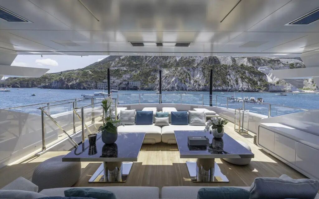 A defining feature of LEL is her expansive beach club—a waterside sanctuary that blends elegance with adventure. This award-winning area unfolds from the transom to reveal a spacious platform that hovers just above the water’s edge. It’s an idyllic place to launch into the crystal-clear sea or lounge in shaded comfort after an exhilarating ride on the Jet Ski. The space is fully equipped with an outdoor sound system, TV, and sumptuous furnishings, making it as suitable for sunbathing and socializing as it is for staging your favorite water sports. This versatile zone transforms from a quiet morning yoga spot into a dynamic hub for afternoon play, all while maintaining a close connection to the ocean just beyond.