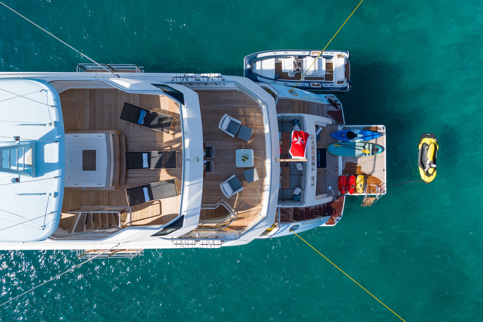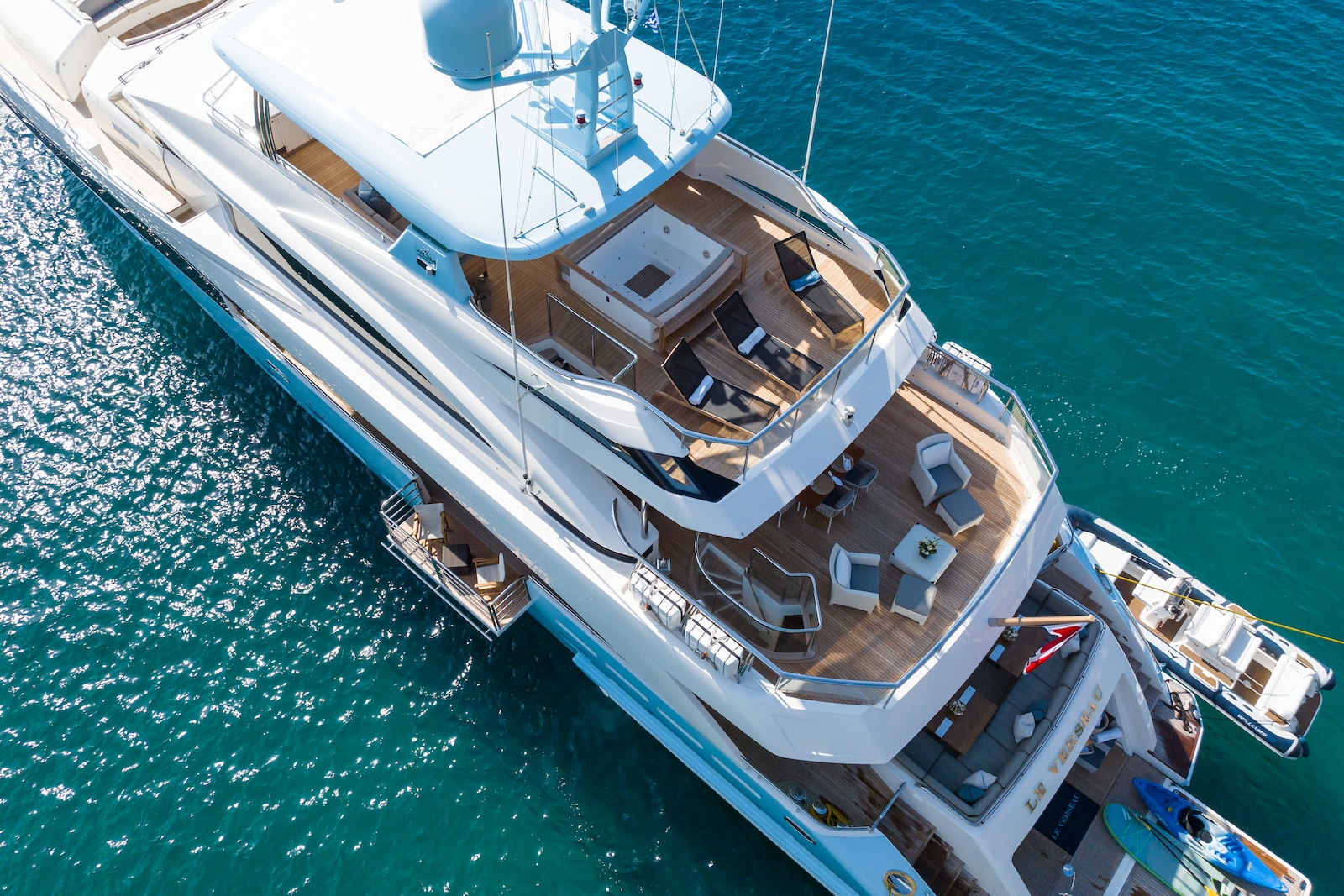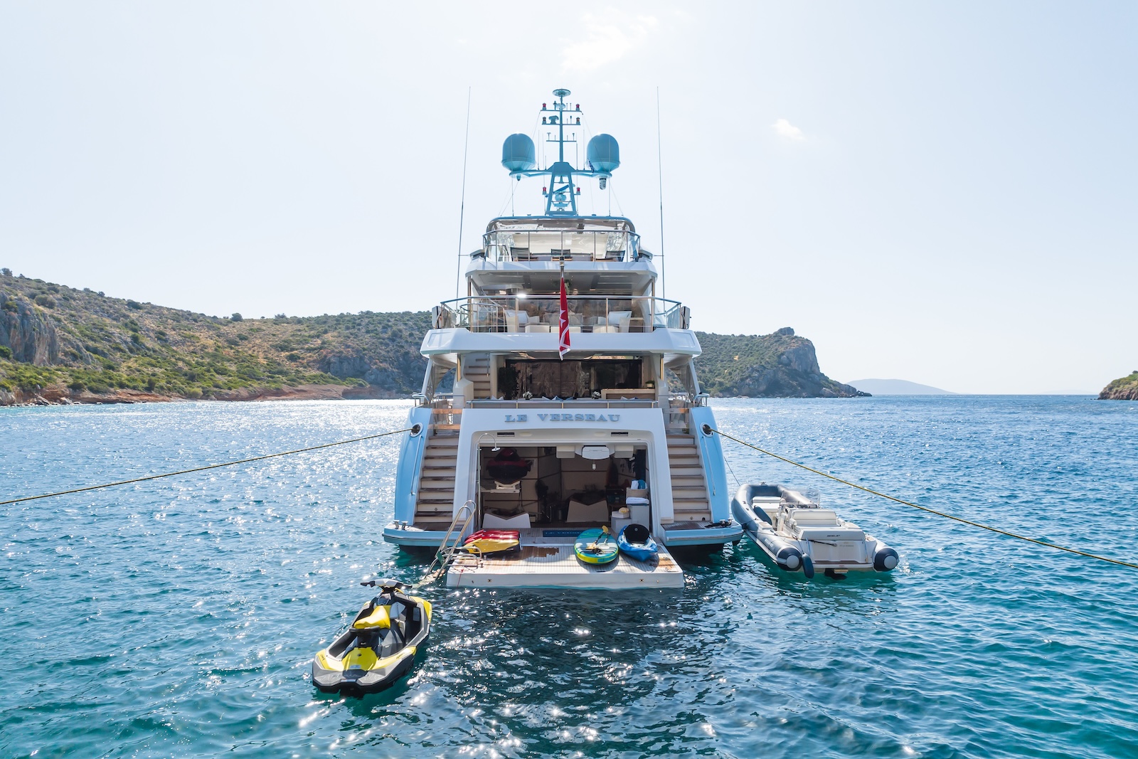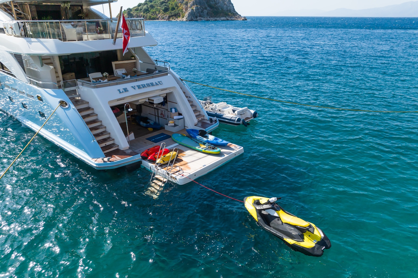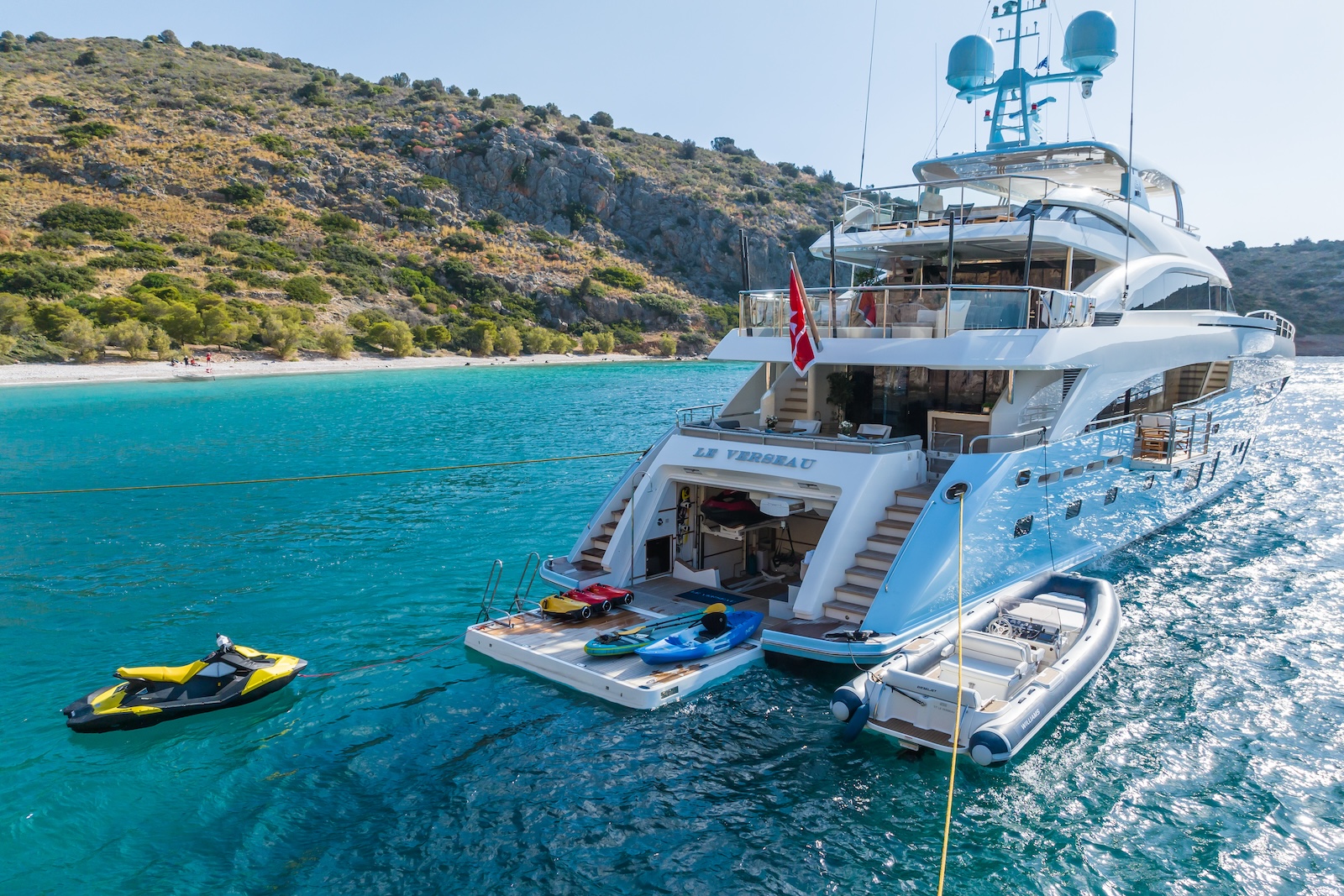 LE VERSEAU’s clean contemporary styling and bespoke Armani and Fendi touches illustrate the level of quality and finish found throughout. Her clever, minimalist, open design gives you a feeling space, whilst high quality finishes and beautifully handcrafted furnishings deliver a sense of opulence. The exterior deck spaces provide a diverse arrangement to suit all occasions; whether that’s elegant alfresco dining on the upper deck, or a more relaxed informal gathering for drinks on the sundeck lounge. With foldable verandas on both sides of the main saloon, you can enjoy sundowners, watching the sunset wherever you anchor. Once the sun sets, why not go into the skylounge and catch a movie on the 75″ Smart screen. Downstairs, LE VERSEAU has a large “drawbridge” style transom door, which forms an impressive beach club / bathing platform which transforms the area into a sociable space for an exciting day of water sports, or relaxation. With a garage full of toys and tenders to occupy the most adventurous of guests; whether that’s a high speed adrenaline ride on one of the jetskis, or rekindling a lost passion for waterskiing, or wake boarding, behind her Williams 625 Jet tender. For a more sedate experience, why not take the paddle boards or open top kayaks to explore the beautiful coastlines and beaches of the Mediterranean.
