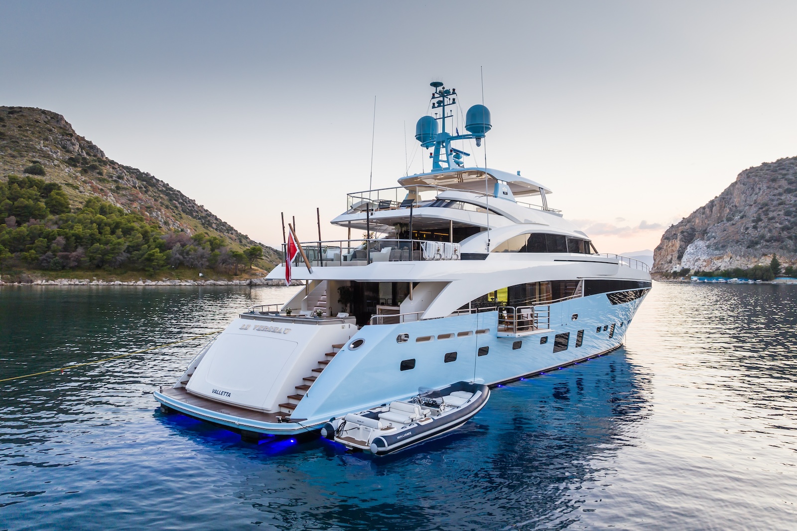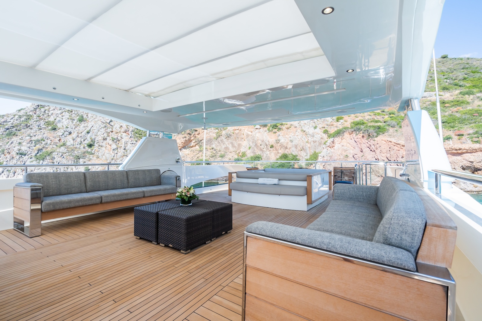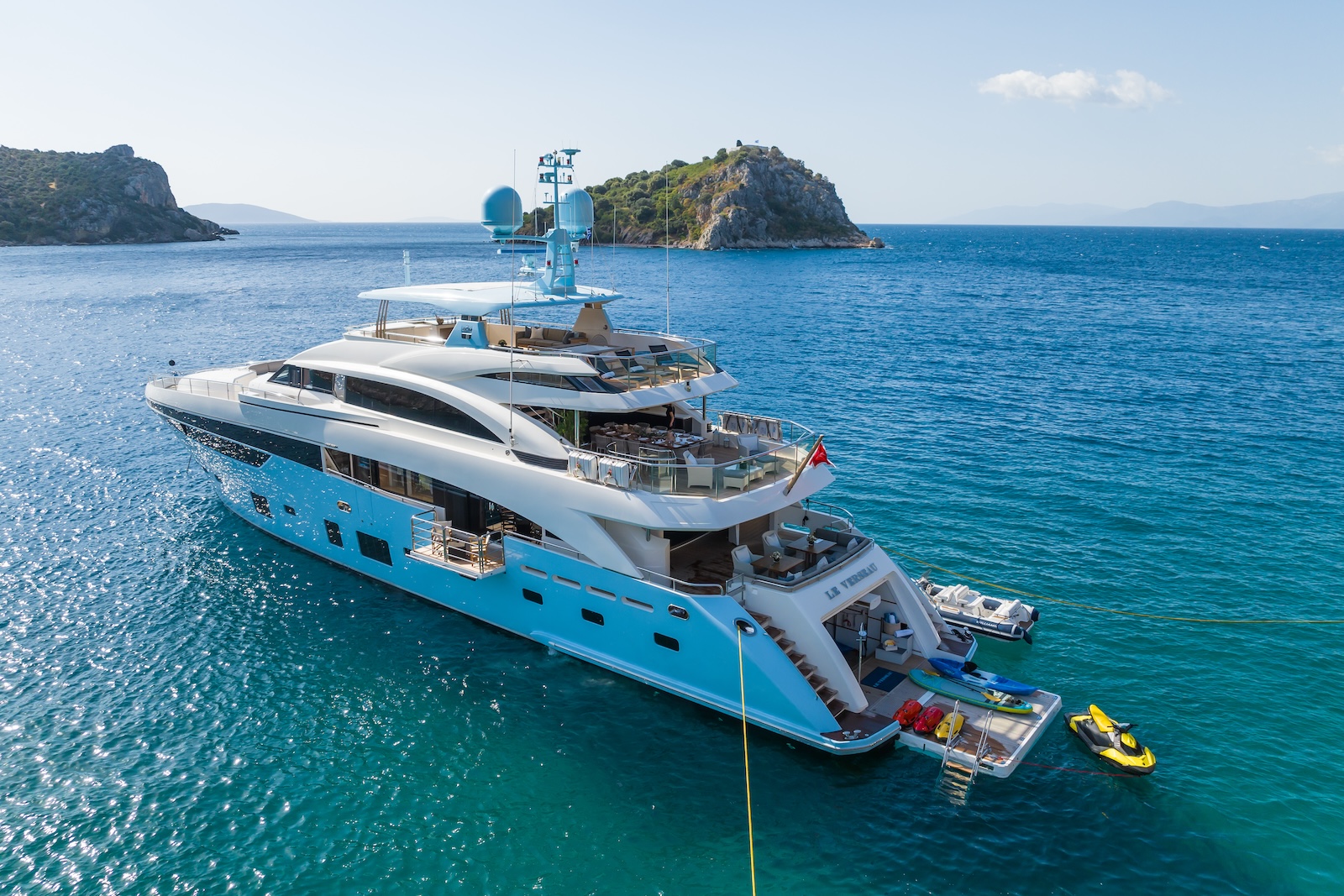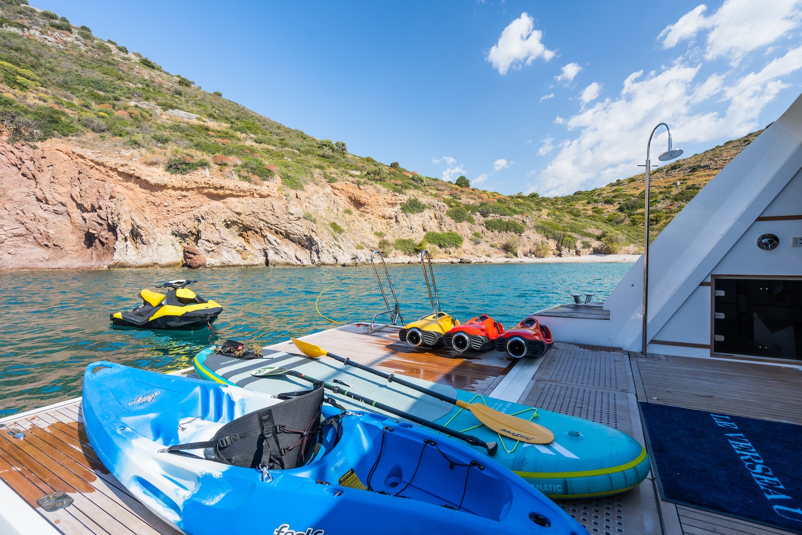 LE VERSEAU’s clean contemporary styling and bespoke Armani and Fendi touches illustrate the level of quality and finish found throughout. Her clever, minimalist, open design gives you a feeling space, whilst high quality finishes and beautifully handcrafted furnishings deliver a sense of opulence. The exterior deck spaces provide a diverse arrangement to suit all occasions; whether that’s elegant alfresco dining on the upper deck, or a more relaxed informal gathering for drinks on the sundeck lounge. With foldable verandas on both sides of the main saloon, you can enjoy sundowners, watching the sunset wherever you anchor. Once the sun sets, why not go into the skylounge and catch a movie on the 75″ Smart screen. Downstairs, LE VERSEAU has a large “drawbridge” style transom door, which forms an impressive beach club / bathing platform which transforms the area into a sociable space for an exciting day of water sports, or relaxation. With a garage full of toys and tenders to occupy the most adventurous of guests; whether that’s a high speed adrenaline ride on one of the jetskis, or rekindling a lost passion for waterskiing, or wake boarding, behind her Williams 625 Jet tender. For a more sedate experience, why not take the paddle boards or open top kayaks to explore the beautiful coastlines and beaches of the Mediterranean.