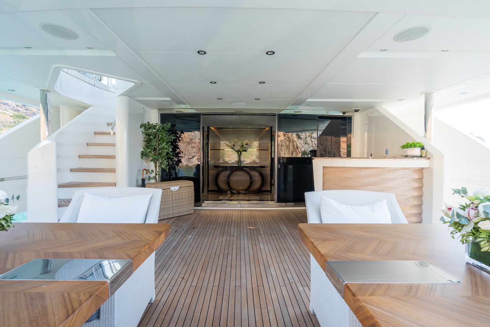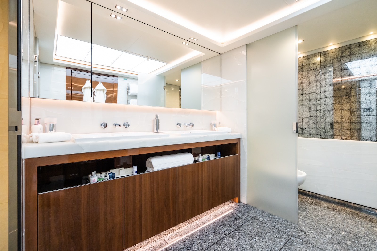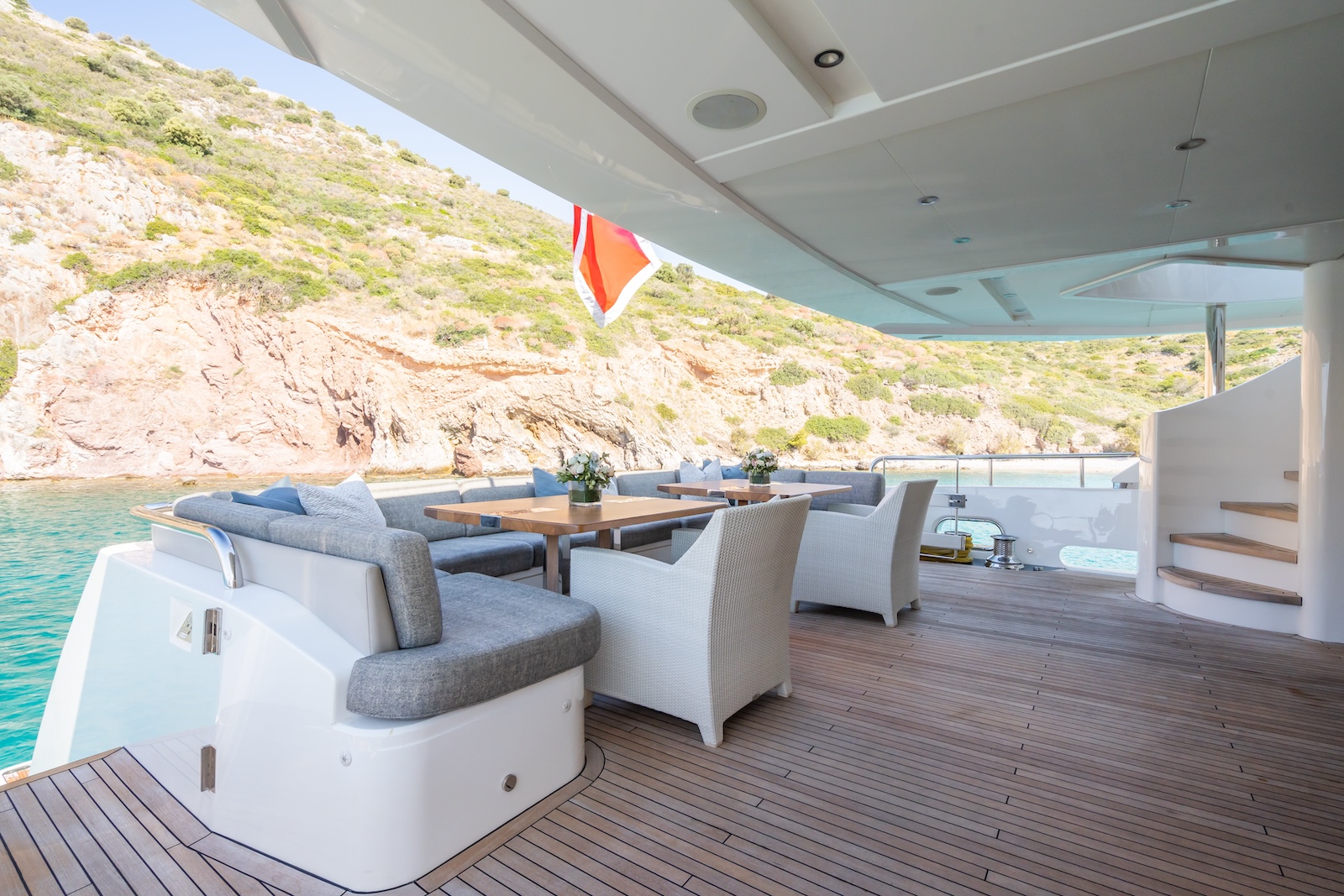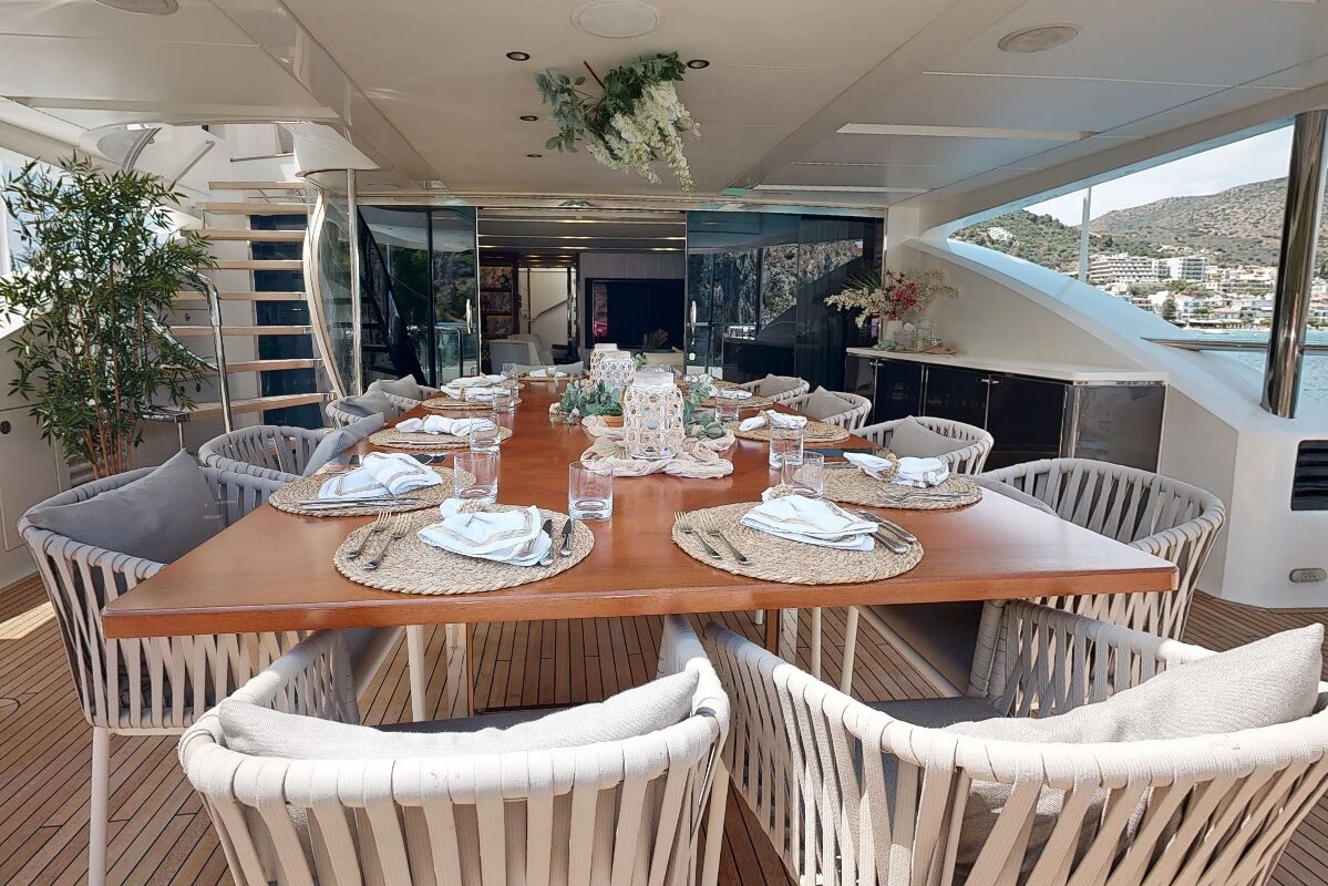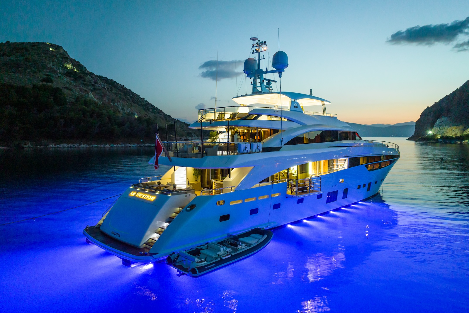 LE VERSEAU’s clean contemporary styling and bespoke Armani and Fendi touches illustrate the level of quality and finish found throughout. Her clever, minimalist, open design gives you a feeling space, whilst high quality finishes and beautifully handcrafted furnishings deliver a sense of opulence. The exterior deck spaces provide a diverse arrangement to suit all occasions; whether that’s elegant alfresco dining on the upper deck, or a more relaxed informal gathering for drinks on the sundeck lounge. With foldable verandas on both sides of the main saloon, you can enjoy sundowners, watching the sunset wherever you anchor. Once the sun sets, why not go into the skylounge and catch a movie on the 75″ Smart screen. Downstairs, LE VERSEAU has a large “drawbridge” style transom door, which forms an impressive beach club / bathing platform which transforms the area into a sociable space for an exciting day of water sports, or relaxation. With a garage full of toys and tenders to occupy the most adventurous of guests; whether that’s a high speed adrenaline ride on one of the jetskis, or rekindling a lost passion for waterskiing, or wake boarding, behind her Williams 625 Jet tender. For a more sedate experience, why not take the paddle boards or open top kayaks to explore the beautiful coastlines and beaches of the Mediterranean.