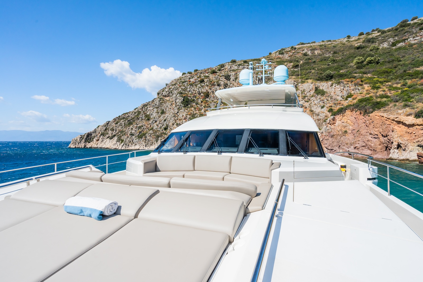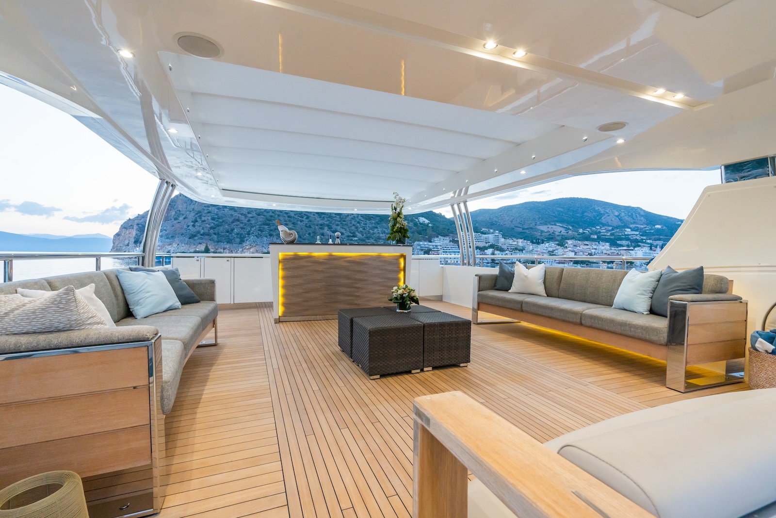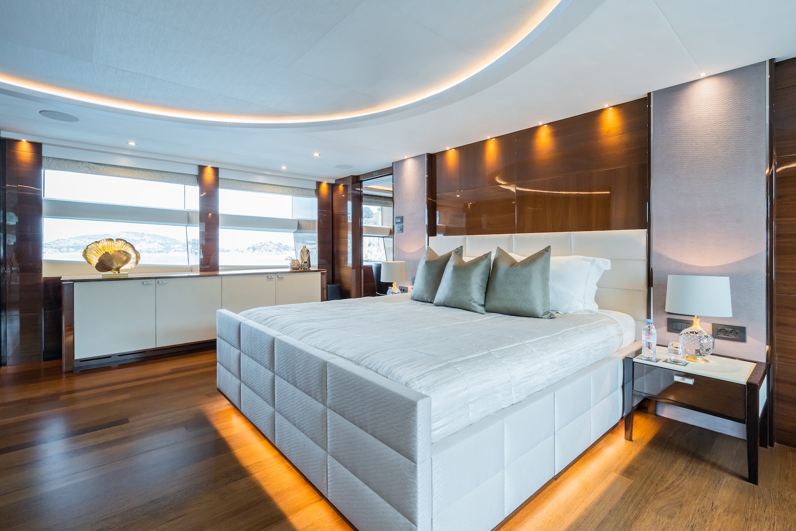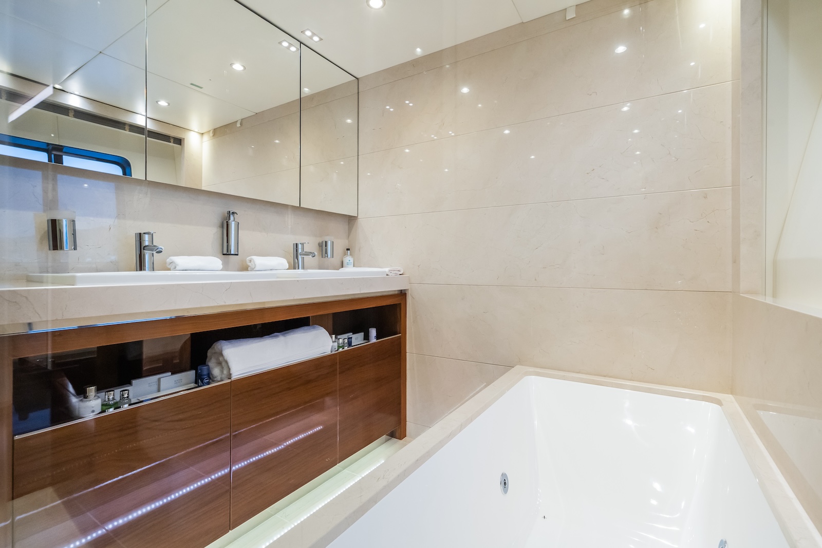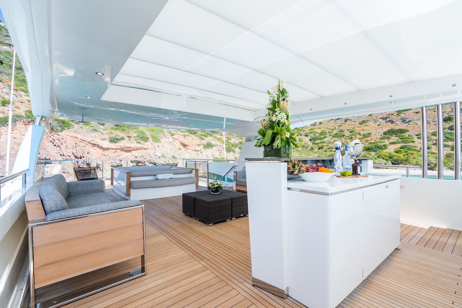 LE VERSEAU’s clean contemporary styling and bespoke Armani and Fendi touches illustrate the level of quality and finish found throughout. Her clever, minimalist, open design gives you a feeling space, whilst high quality finishes and beautifully handcrafted furnishings deliver a sense of opulence. The exterior deck spaces provide a diverse arrangement to suit all occasions; whether that’s elegant alfresco dining on the upper deck, or a more relaxed informal gathering for drinks on the sundeck lounge. With foldable verandas on both sides of the main saloon, you can enjoy sundowners, watching the sunset wherever you anchor. Once the sun sets, why not go into the skylounge and catch a movie on the 75″ Smart screen. Downstairs, LE VERSEAU has a large “drawbridge” style transom door, which forms an impressive beach club / bathing platform which transforms the area into a sociable space for an exciting day of water sports, or relaxation. With a garage full of toys and tenders to occupy the most adventurous of guests; whether that’s a high speed adrenaline ride on one of the jetskis, or rekindling a lost passion for waterskiing, or wake boarding, behind her Williams 625 Jet tender. For a more sedate experience, why not take the paddle boards or open top kayaks to explore the beautiful coastlines and beaches of the Mediterranean.