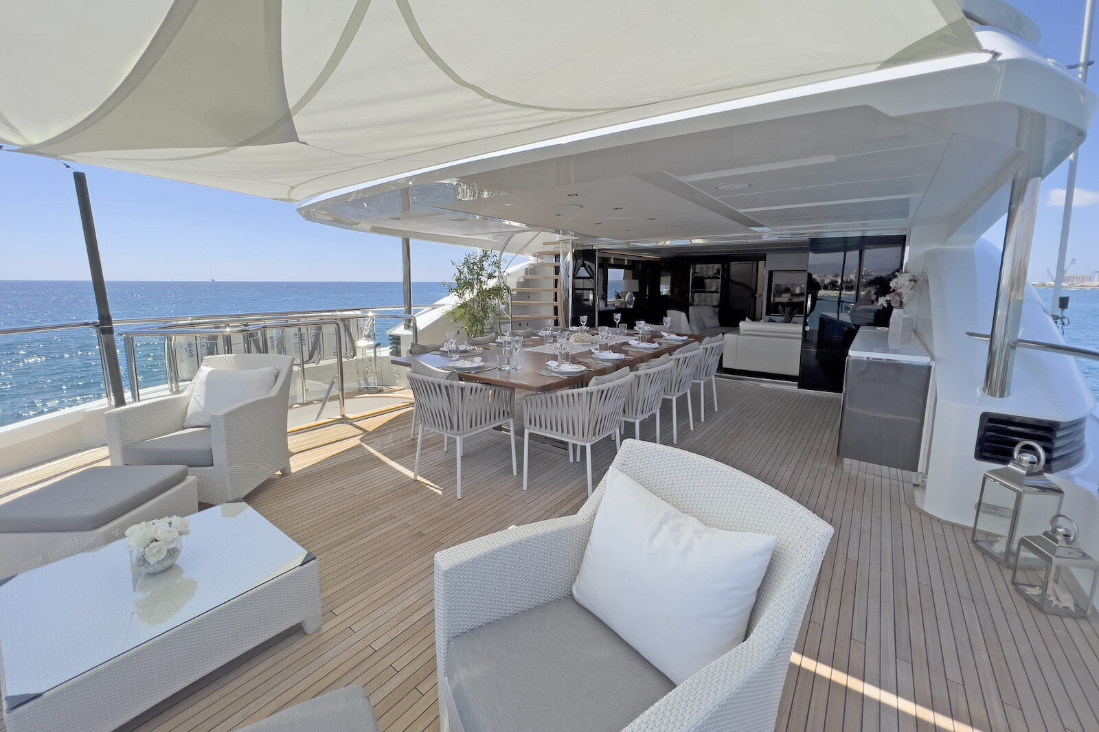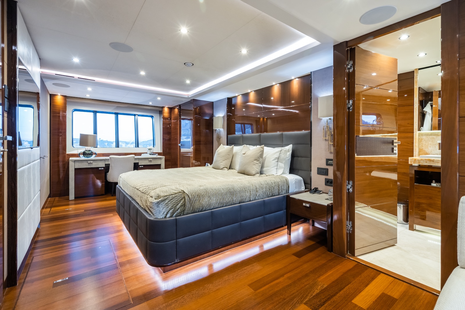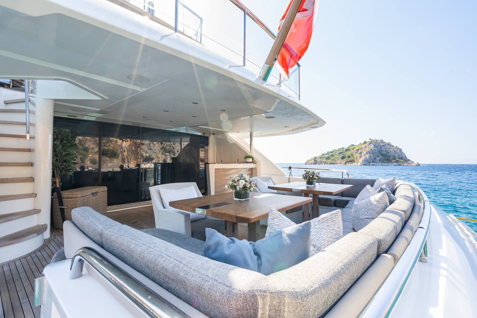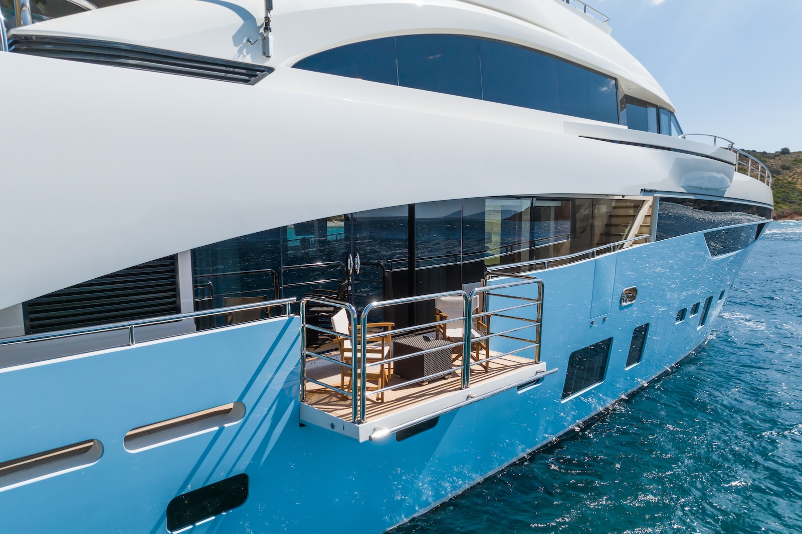 LE VERSEAU’s clean contemporary styling and bespoke Armani and Fendi touches illustrate the level of quality and finish found throughout. Her clever, minimalist, open design gives you a feeling space, whilst high quality finishes and beautifully handcrafted furnishings deliver a sense of opulence. The exterior deck spaces provide a diverse arrangement to suit all occasions; whether that’s elegant alfresco dining on the upper deck, or a more relaxed informal gathering for drinks on the sundeck lounge. With foldable verandas on both sides of the main saloon, you can enjoy sundowners, watching the sunset wherever you anchor. Once the sun sets, why not go into the skylounge and catch a movie on the 75″ Smart screen. Downstairs, LE VERSEAU has a large “drawbridge” style transom door, which forms an impressive beach club / bathing platform which transforms the area into a sociable space for an exciting day of water sports, or relaxation. With a garage full of toys and tenders to occupy the most adventurous of guests; whether that’s a high speed adrenaline ride on one of the jetskis, or rekindling a lost passion for waterskiing, or wake boarding, behind her Williams 625 Jet tender. For a more sedate experience, why not take the paddle boards or open top kayaks to explore the beautiful coastlines and beaches of the Mediterranean.