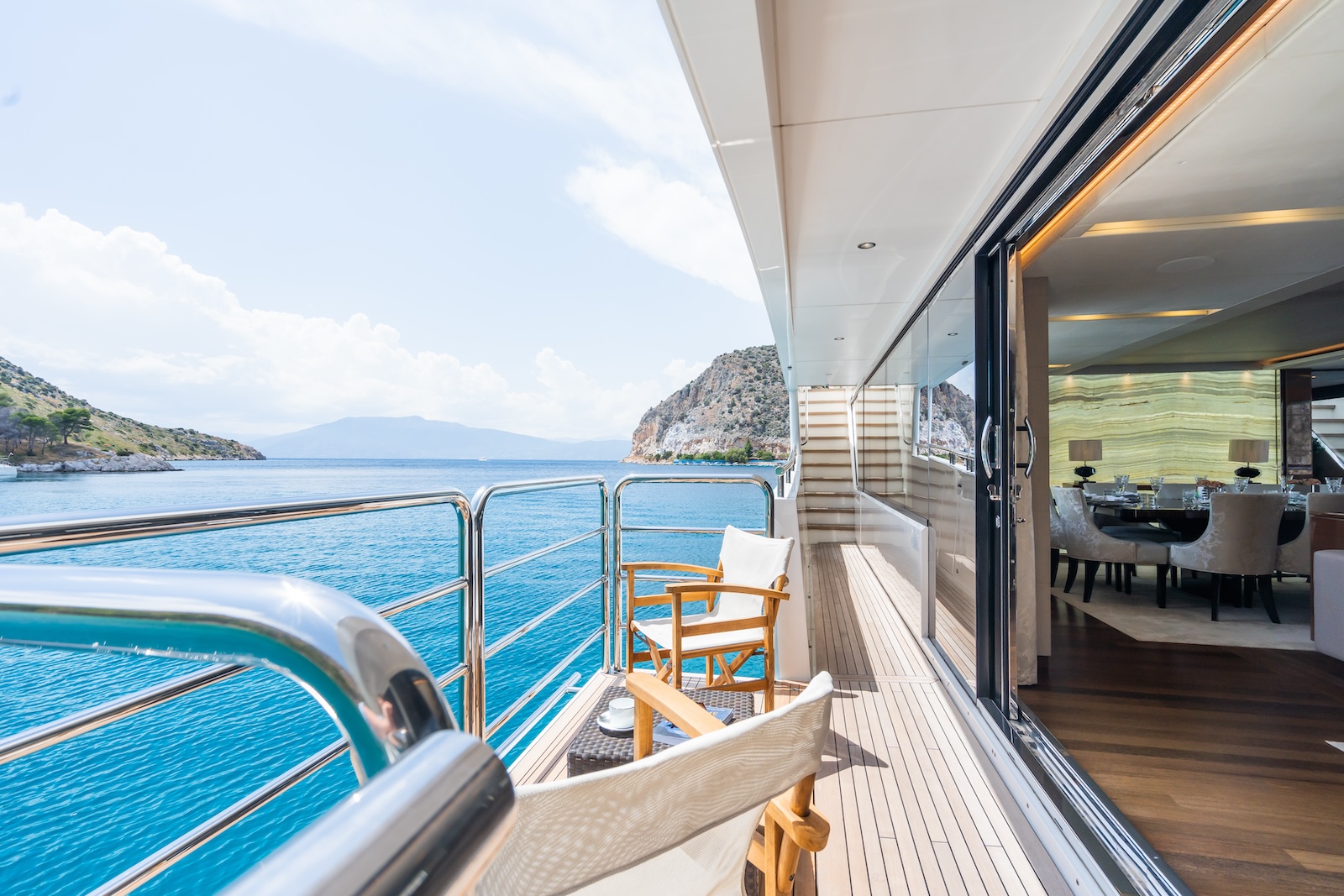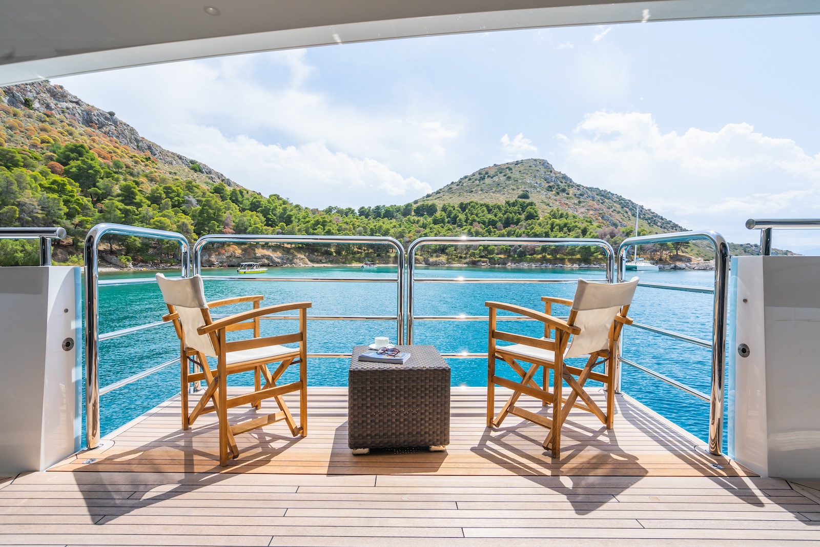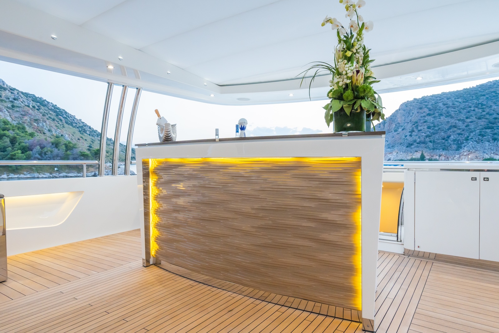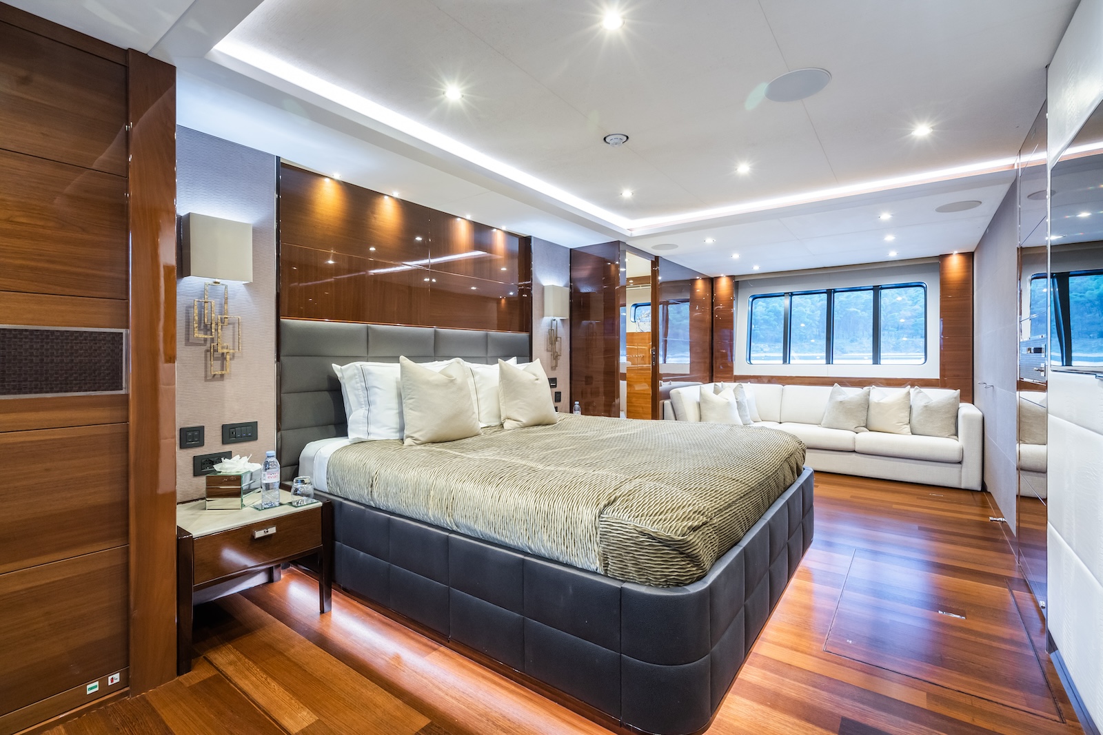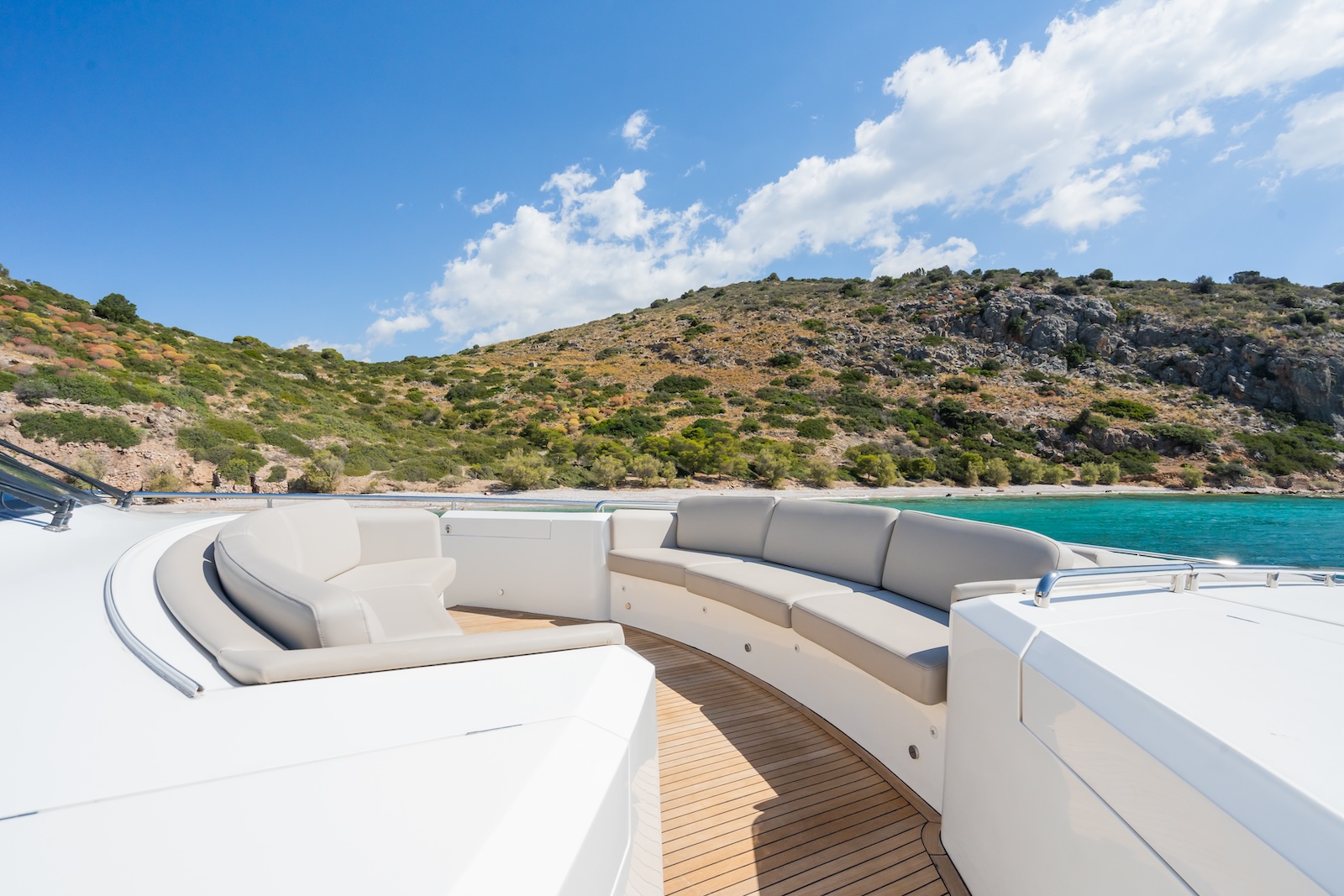 LE VERSEAU’s clean contemporary styling and bespoke Armani and Fendi touches illustrate the level of quality and finish found throughout. Her clever, minimalist, open design gives you a feeling space, whilst high quality finishes and beautifully handcrafted furnishings deliver a sense of opulence. The exterior deck spaces provide a diverse arrangement to suit all occasions; whether that’s elegant alfresco dining on the upper deck, or a more relaxed informal gathering for drinks on the sundeck lounge. With foldable verandas on both sides of the main saloon, you can enjoy sundowners, watching the sunset wherever you anchor. Once the sun sets, why not go into the skylounge and catch a movie on the 75″ Smart screen. Downstairs, LE VERSEAU has a large “drawbridge” style transom door, which forms an impressive beach club / bathing platform which transforms the area into a sociable space for an exciting day of water sports, or relaxation. With a garage full of toys and tenders to occupy the most adventurous of guests; whether that’s a high speed adrenaline ride on one of the jetskis, or rekindling a lost passion for waterskiing, or wake boarding, behind her Williams 625 Jet tender. For a more sedate experience, why not take the paddle boards or open top kayaks to explore the beautiful coastlines and beaches of the Mediterranean.