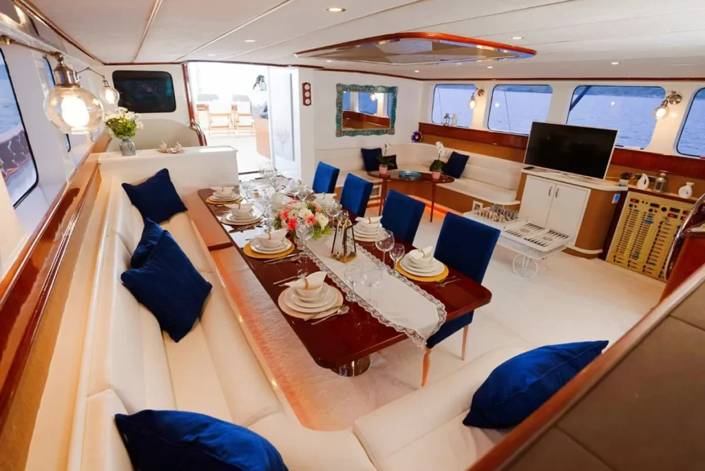 Welcome aboard to an unparalleled journey of luxury and sophistication. The yacht’s interior is meticulously designed to offer the ultimate in comfort and elegance.Â