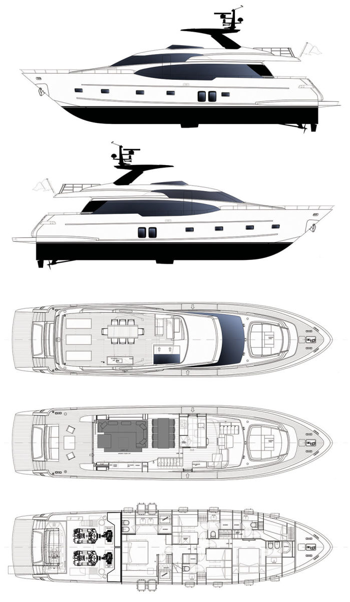 LUCKY’s layout offers a harmonious balance between privacy and social spaces. The lower deck features four guest cabins, including a spacious Master suite, an elegant VIP cabin, and two additional guest cabins with flexible sleeping arrangements. Each cabin is designed to provide utmost comfort and privacy, with en-suite facilities ensuring convenience for guests. The seamless indoor-outdoor flow allows for easy access to the main deck salon and dining area, which effortlessly connects to the expansive flybridge. The flybridge offers ample outdoor seating, sunbathing areas, and panoramic views, creating a versatile space for relaxation and socializing. Overall, LUCKY’s layout caters to the diverse needs of guests, offering both secluded retreats and communal gathering areas.