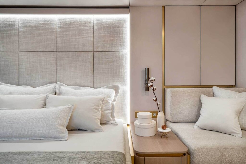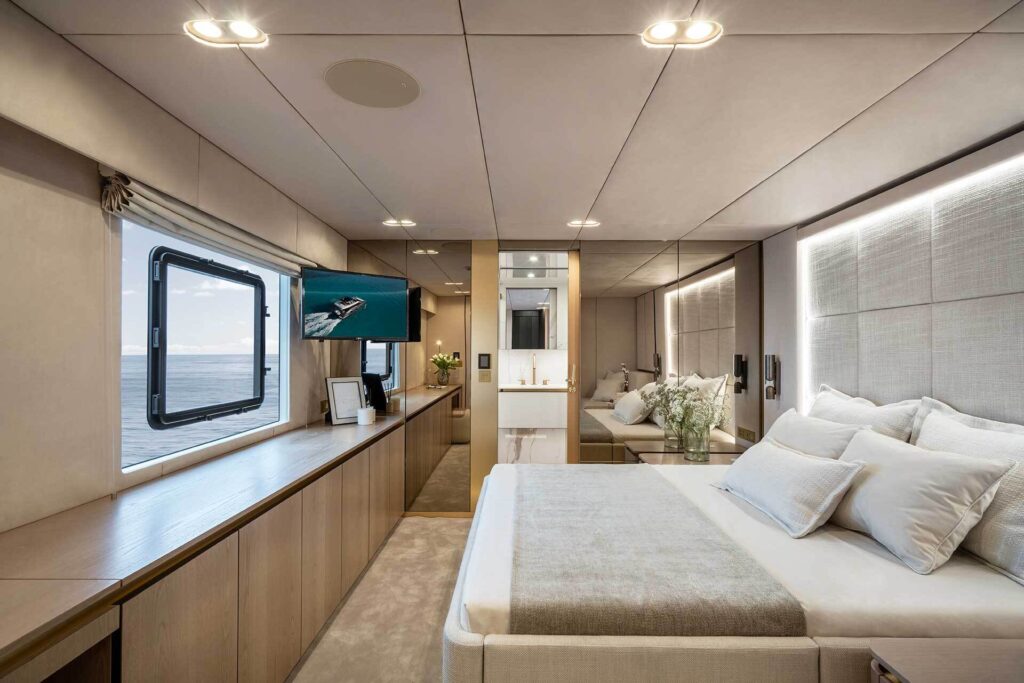 The spacious cabins are havens of tranquility, featuring plush bedding and panoramic windows that frame the mesmerizing seascapes.Â
